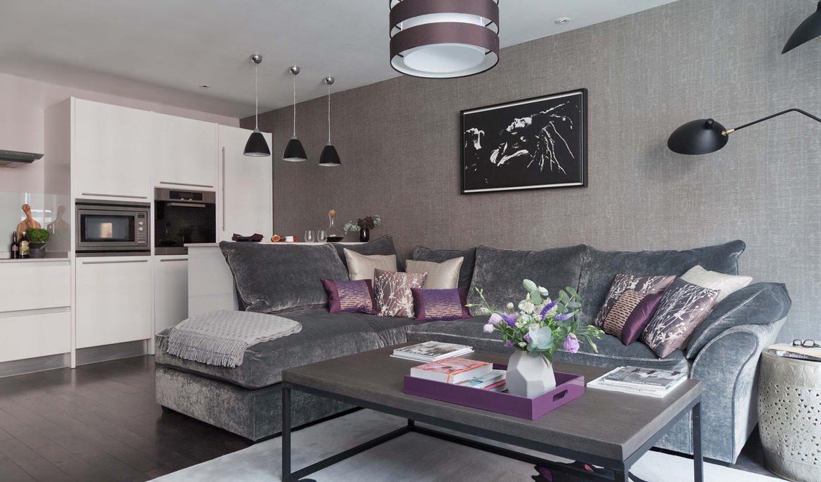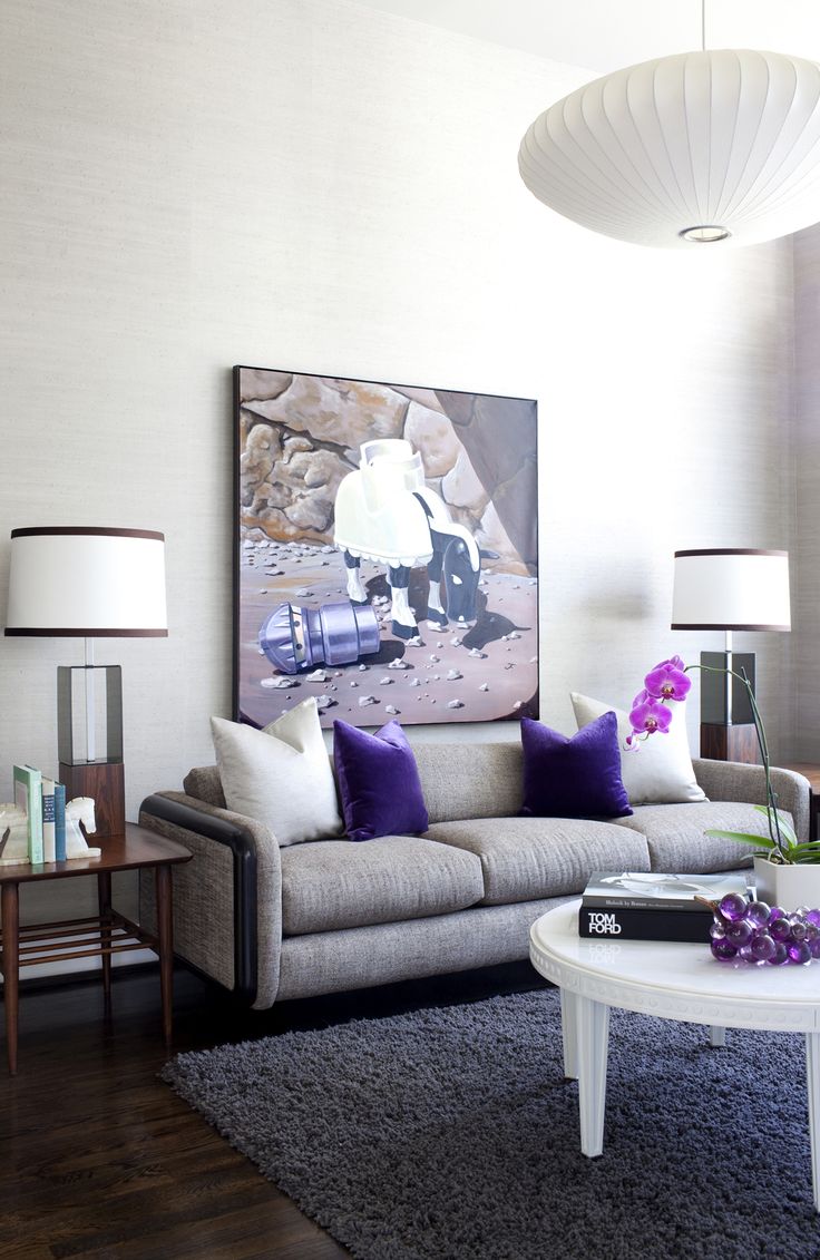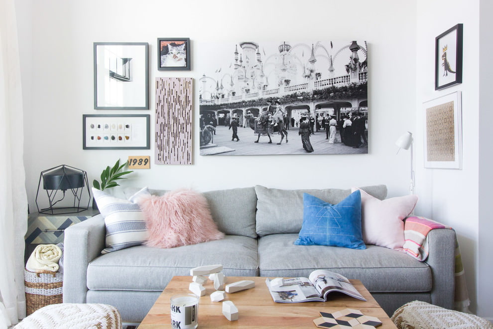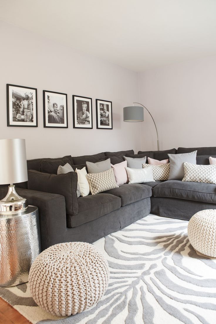 | Bright decor | To dilute grey colour can be used bright accessories for living room. | 1. Decorative pillows of lilac or pink shades more suitable for light–gray sofa. With this decoration, the atmosphere will become lighter and more romantic, and soft furniture won't seem boring.