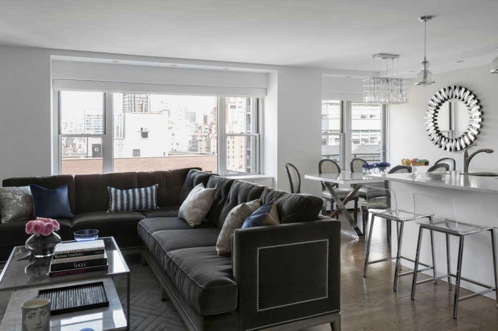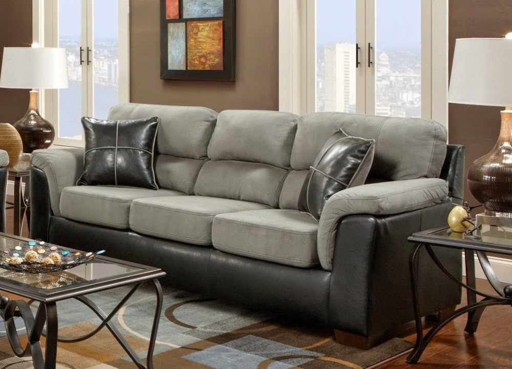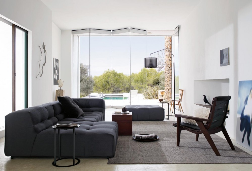 A black and gray sofa looks great in a high-tech living room.