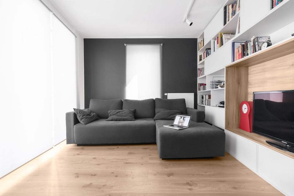 Discreet living room interior with gray corner sofa