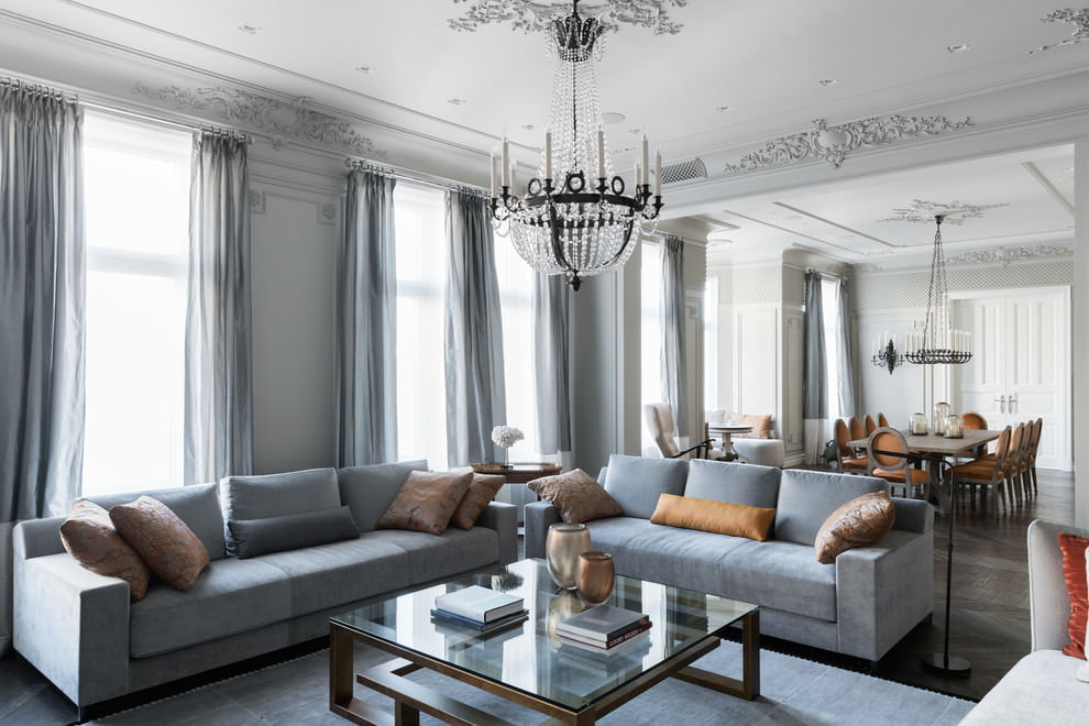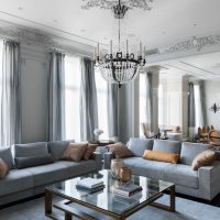 Important. Do not forget that the style of the living room must be combined with the general design concept of the house or apartment. The gray color in the design will emphasize the taste and elegance of the created environment, add warmth and comfort to any room.