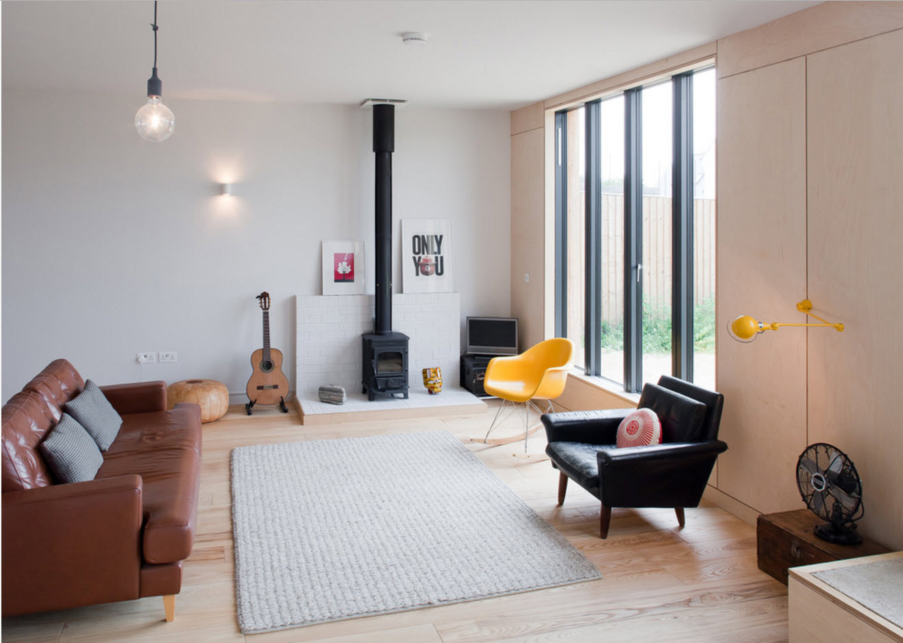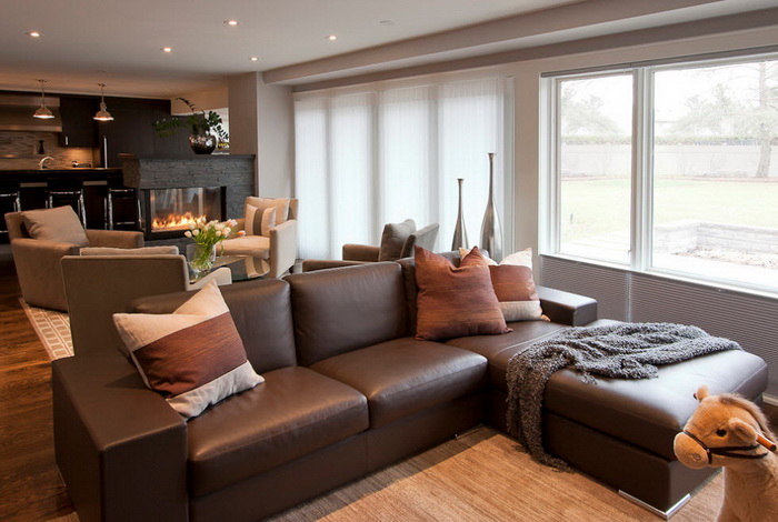A dark brown sofa is perfect for the Scandinavian style. In combination with a snow-white carpet making its way through a dark laminate and a fireplace, it will create a cold atmosphere of the north.