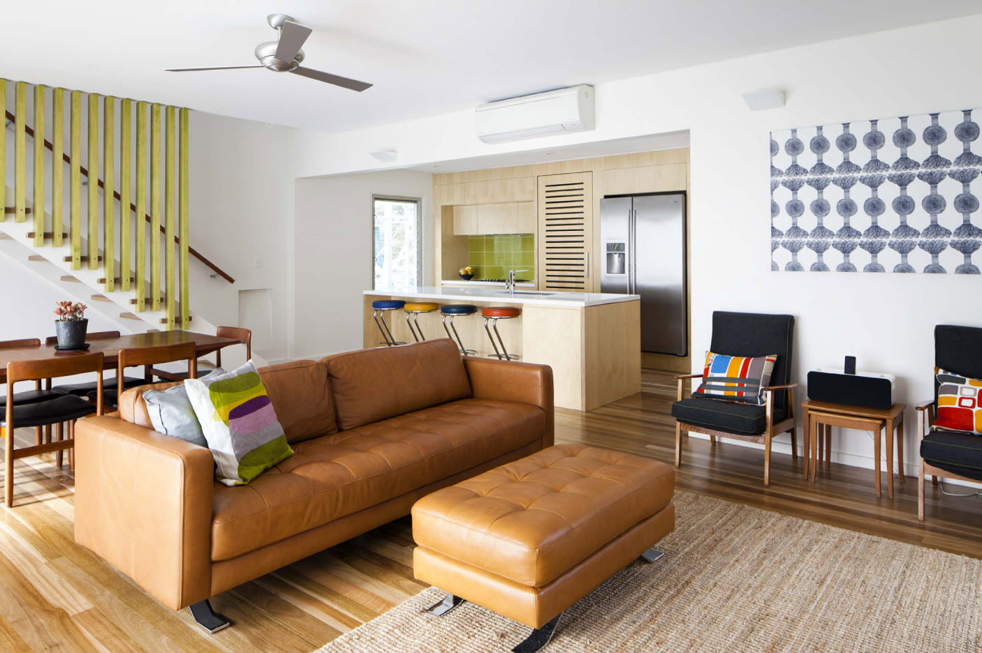 Emphasis on brightness. Brown color looks interesting in combination with bright shades, for example, with sofa cushions in light green, turquoise and pink colors