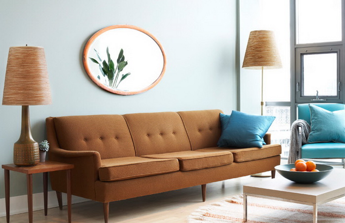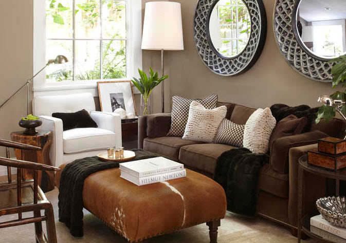 The brown sofa in the interior should stand out. Therefore, it must not be allowed to merge with the surrounding surfaces. Therefore, the walls also need to be made different in several tones or to choose a completely contrasting shade.