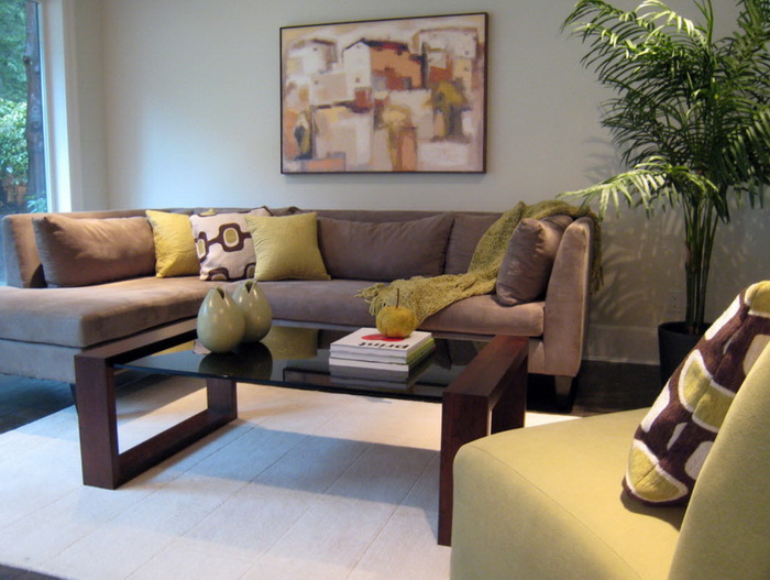 It goes well with brown, blue, gray, white, red. They will create a good background, and will contrast with the furniture, highlighting it. However, do not forget that the shade of the sofa is of particular importance. When combining colors, remember that they should not overlap the main element.