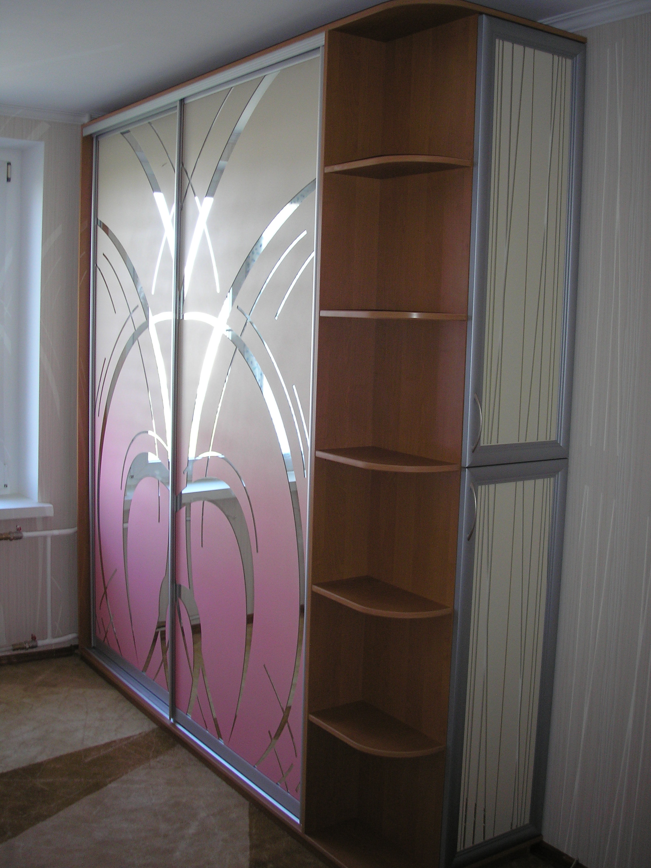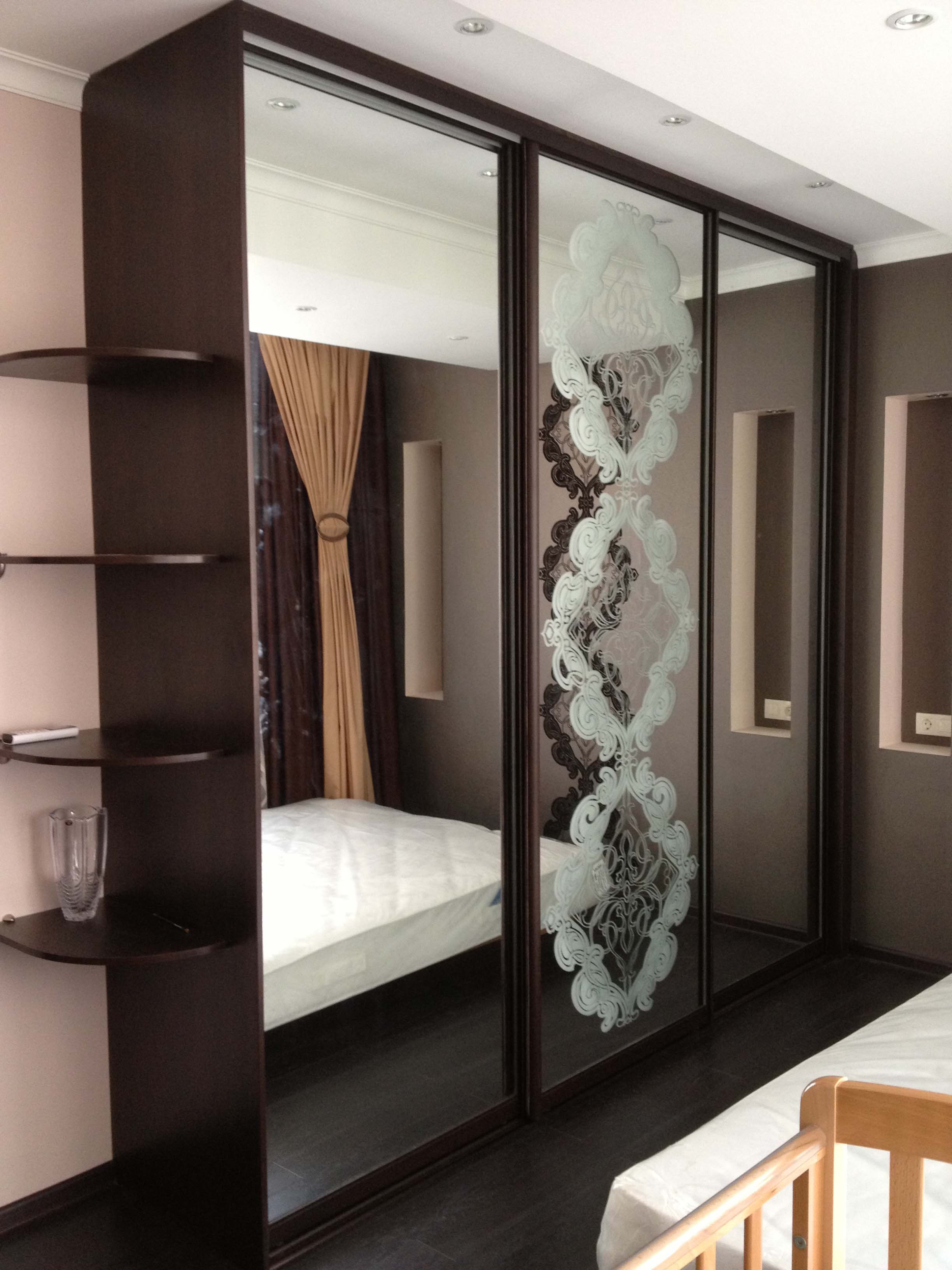 Bright wardrobe with mirrored doors and patterns
