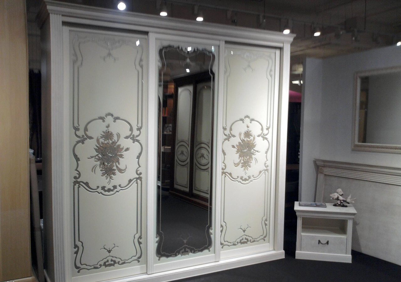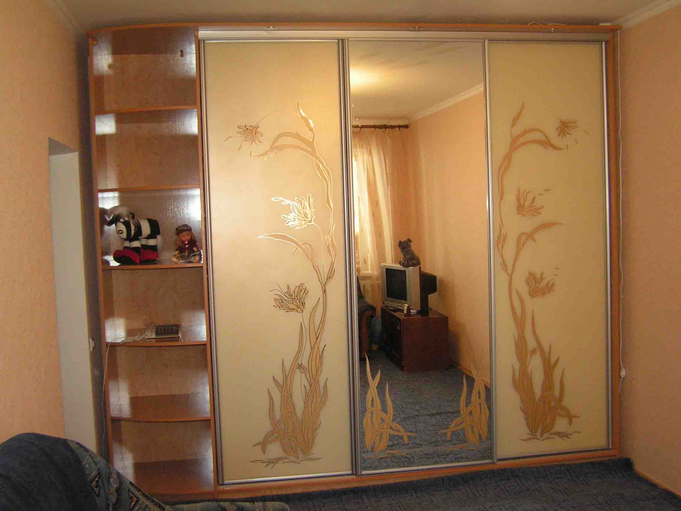 Decorative glasses are the varieties listed above. Rough sandblasting or frosted glass can be combined with sliding mirrors. This design of the doors of the wardrobe is suitable for classic and modern interiors.