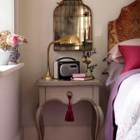 - An exquisite bedside table with mirrors, rhinestones or gilded carvings is picked up in the glamorous bedroom of a secular lady.
