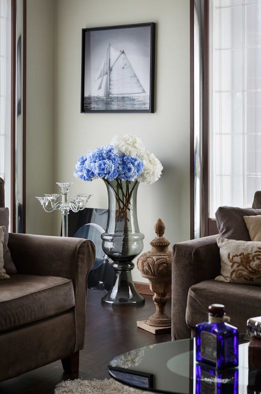Vases of the most various forms, sizes, types are used. This detail can emphasize the stylistic orientation, hide the flaws of the room, and can become its center, reflecting the design idea.