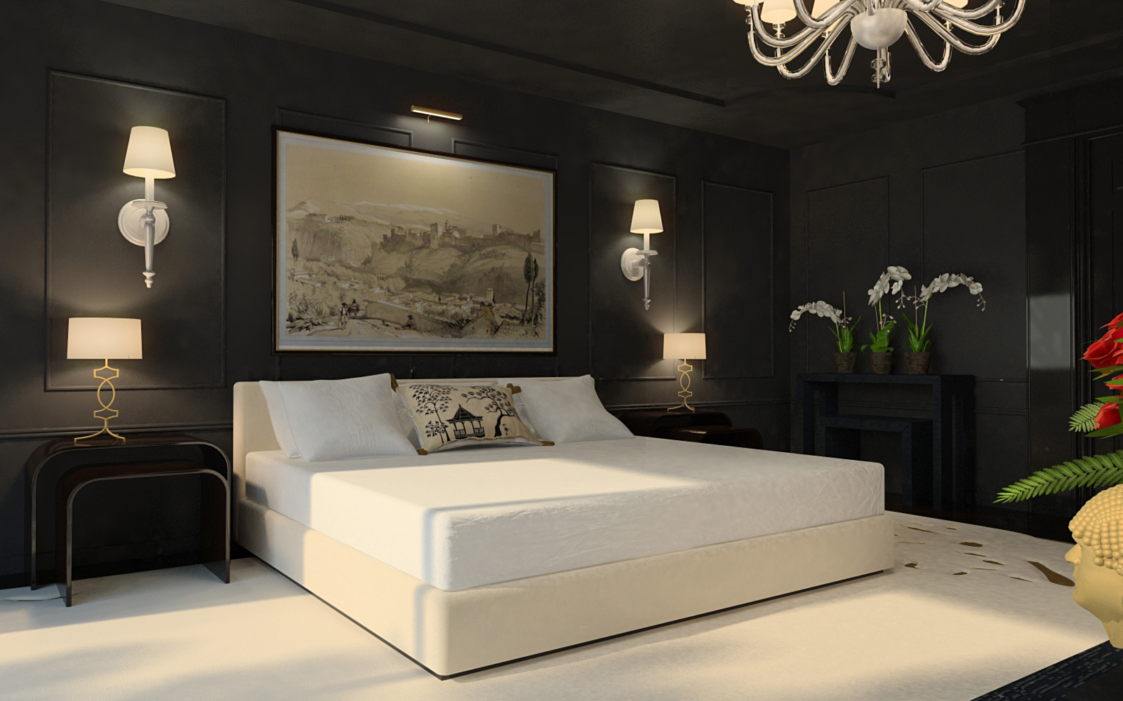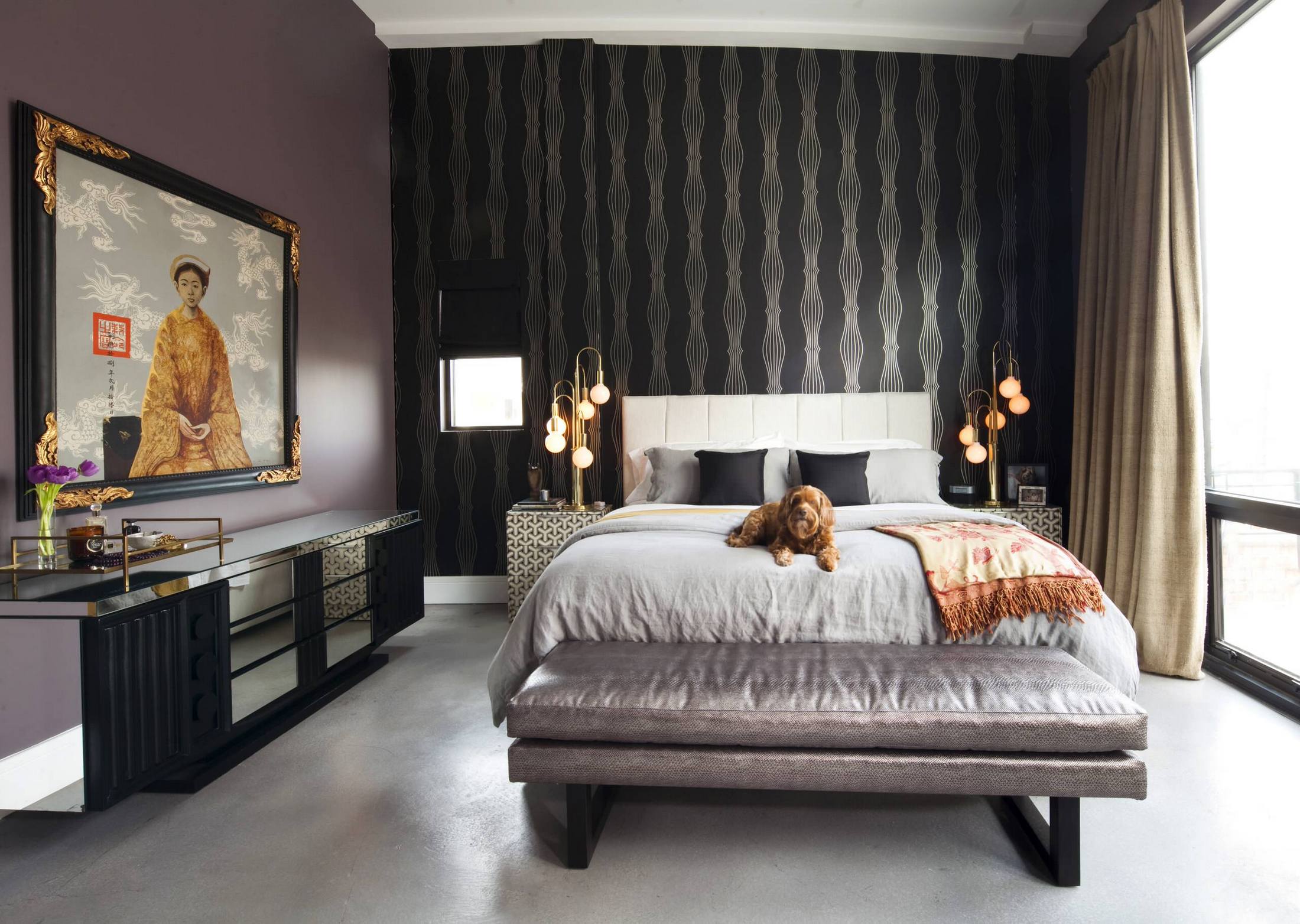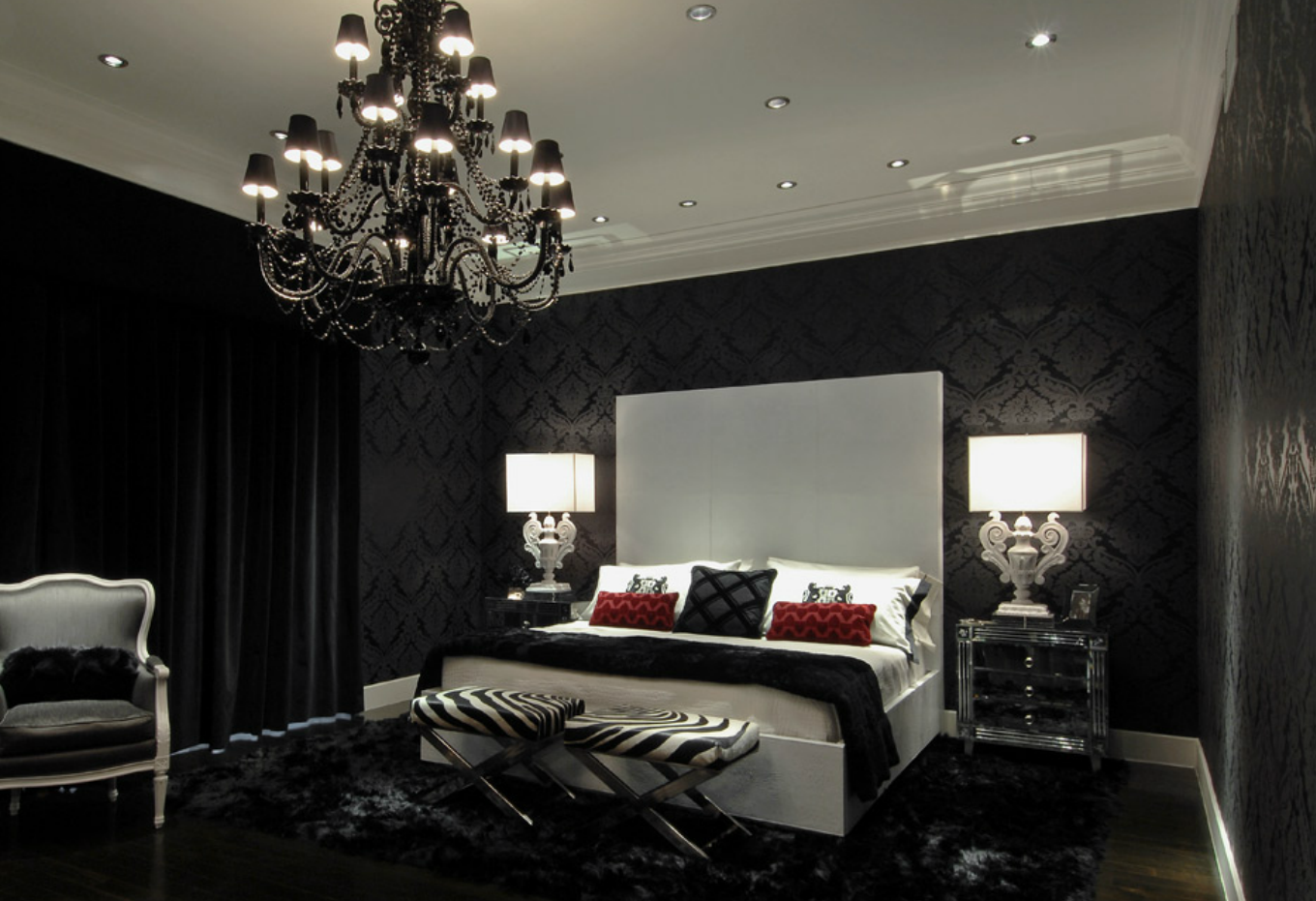 Chic bedroom with black wallpaper