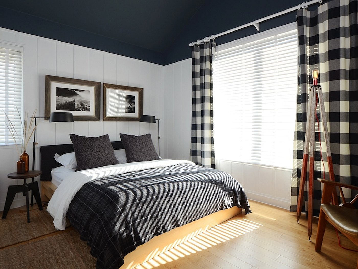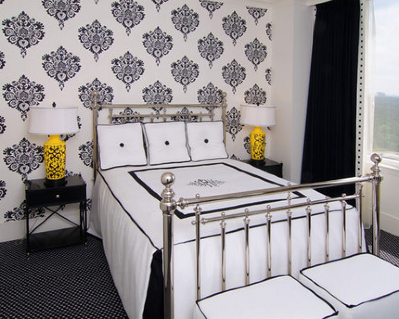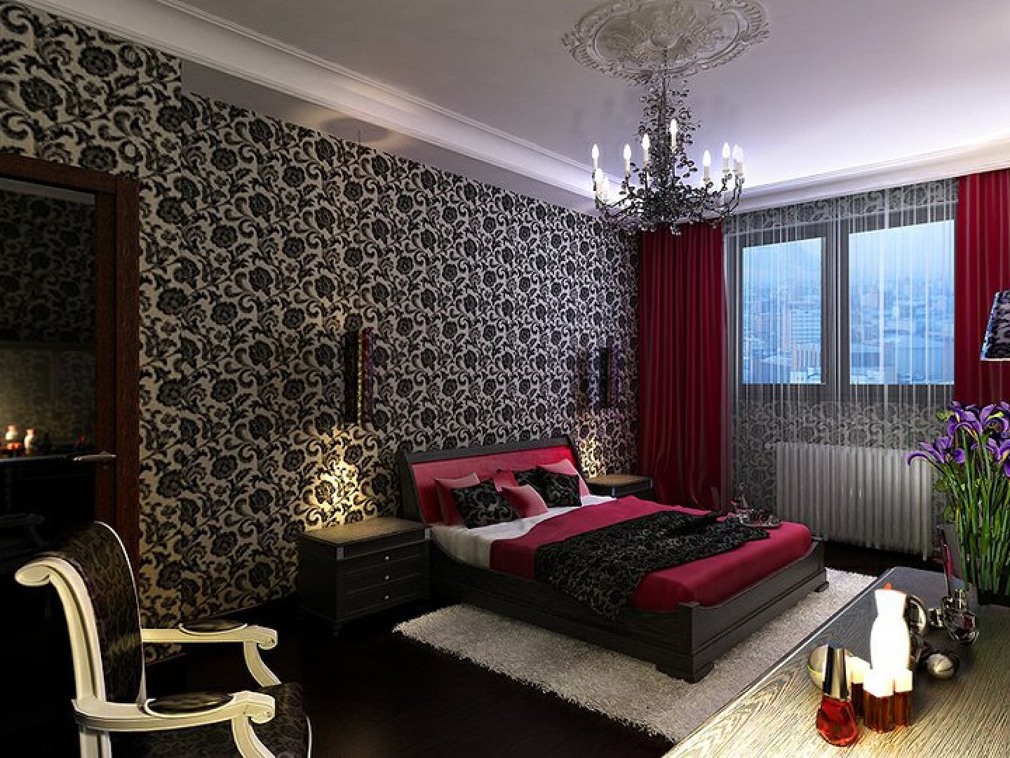 Chic bedroom with black wallpaper