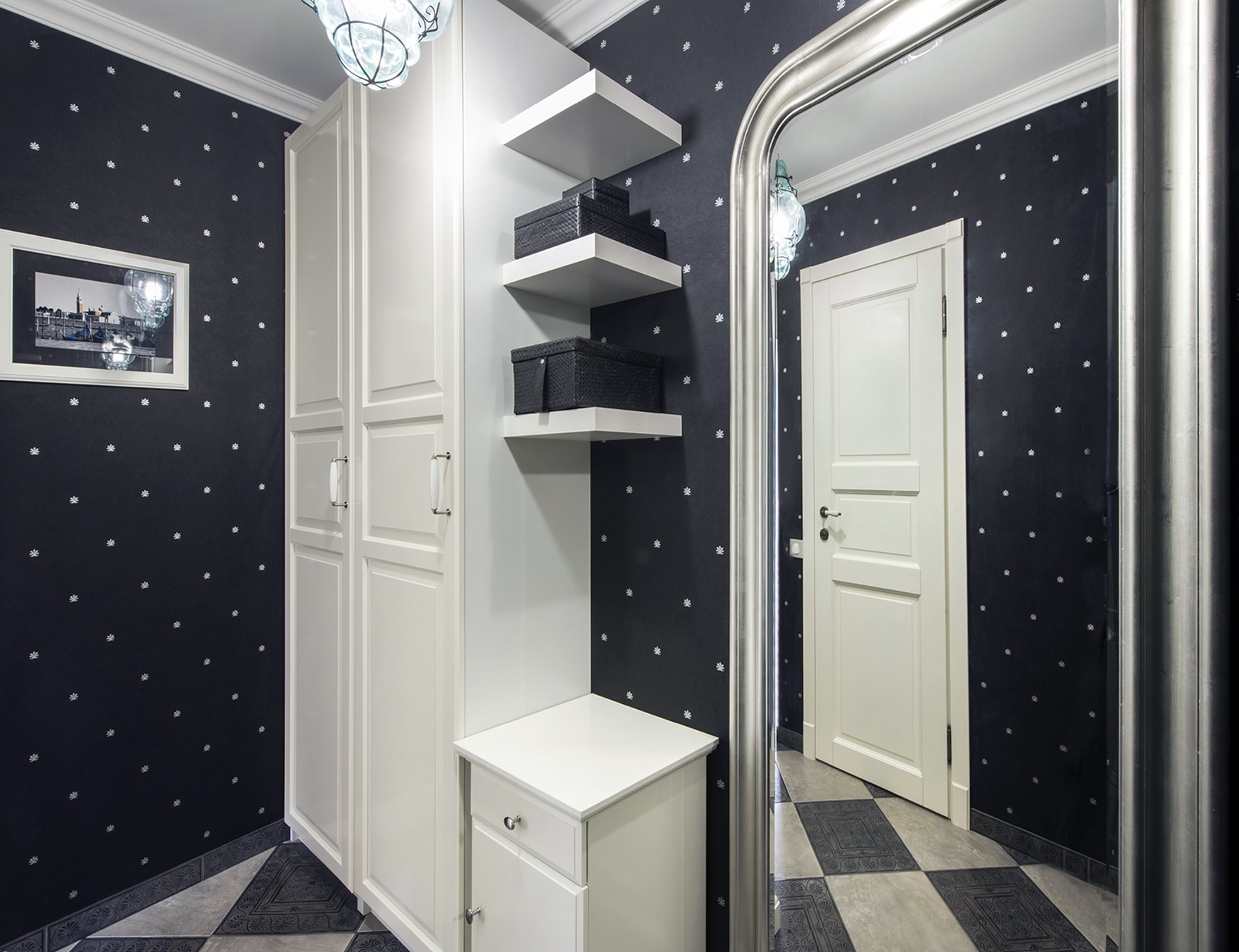 This is the most amazing color, or rather, its complete absence, the absorption of the entire gamut of the spectrum. It has no shades and midtones, but perception in an apartment depends on the texture of surfaces and light reflection. Glossy wallpapers reflect light well on the south side and do not seem dark, especially in combination with mirrors, as in the photo.