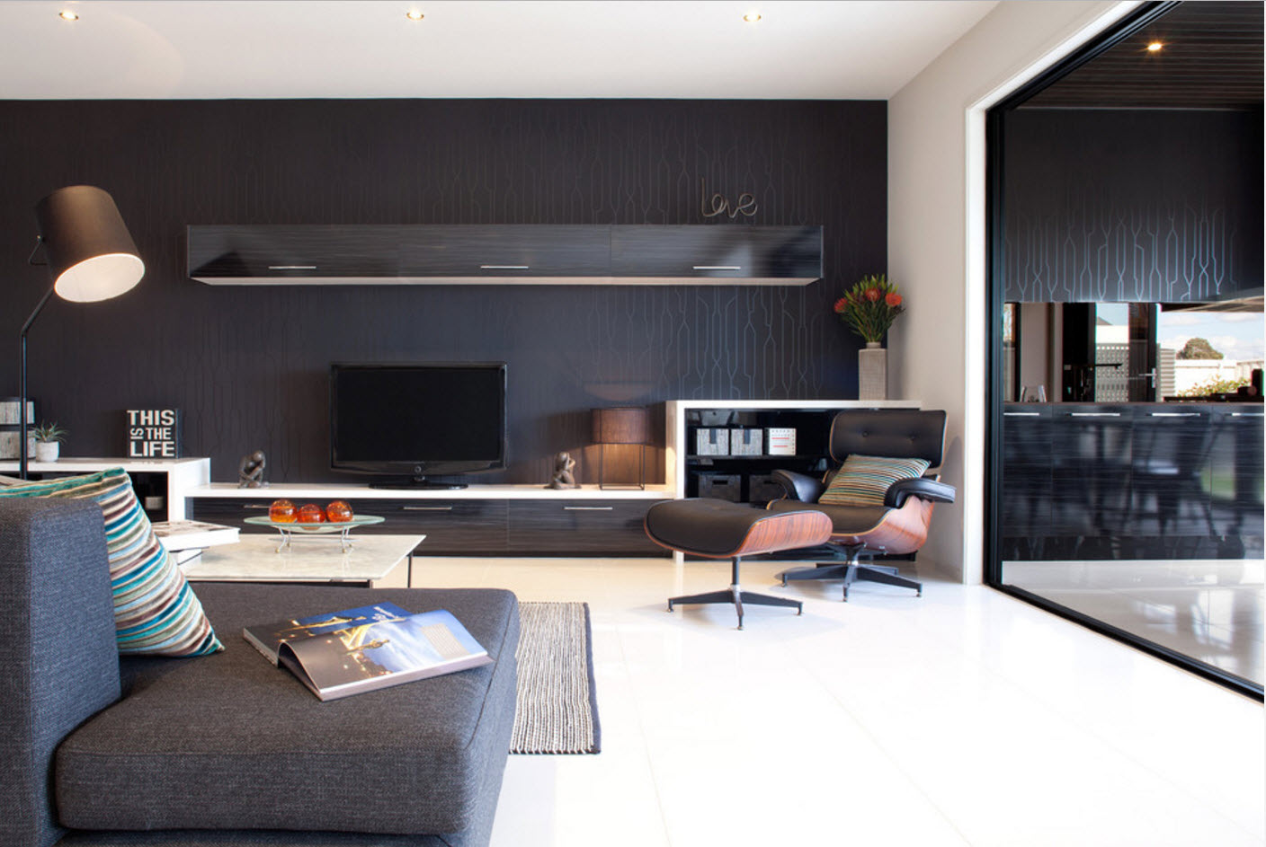 - An accent wall is often used by designers to create an exclusive interior. For this, an unexpected solution is used, for example, black velvet wallpaper. This is a great backdrop for a glass showcase with a collection of weapons, dishes, a rare figurine or exotic plants.
