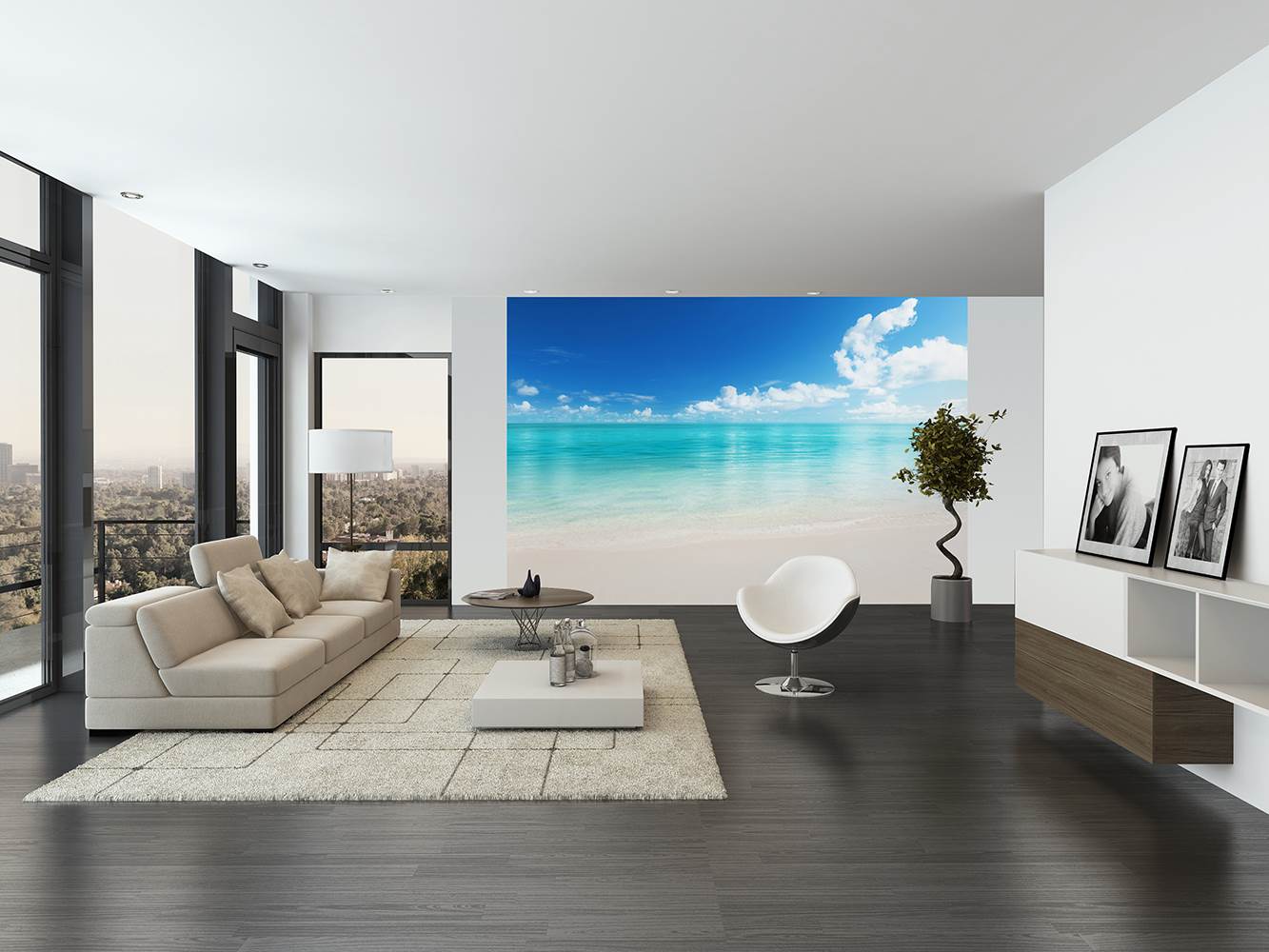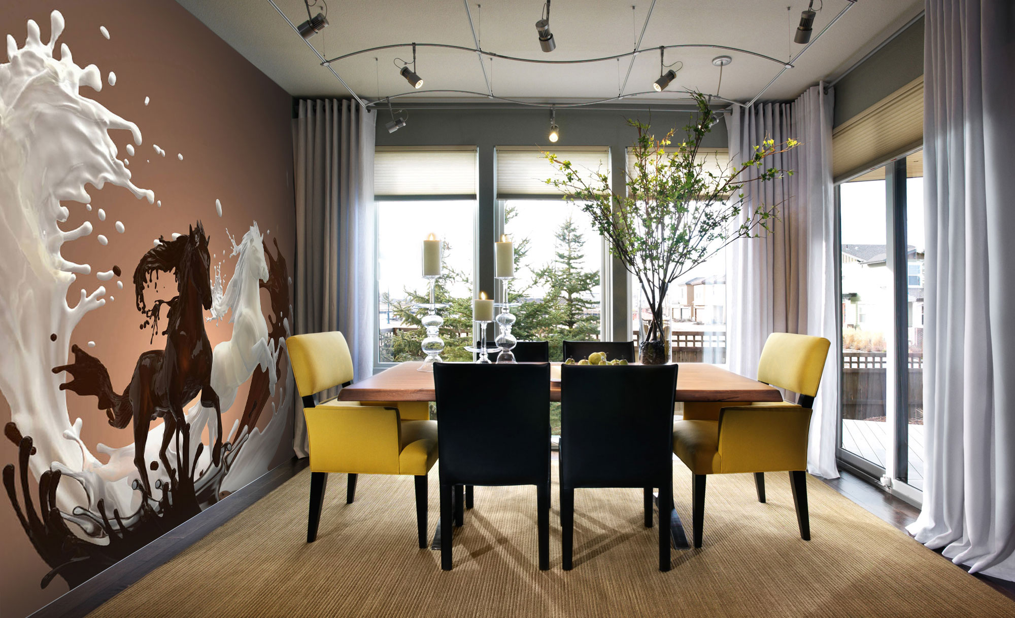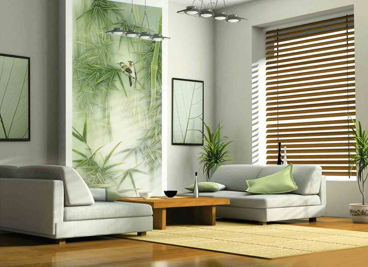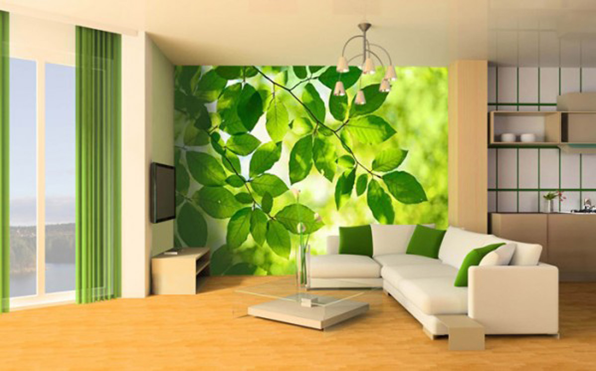 - Divide the space into zones. Wall murals identify certain areas in the living room. For example, an image of nature or a drawing of a city landscape will decorate the dining area, and the wall covering in the ethnic style will complement the storage of souvenirs brought from travel.
