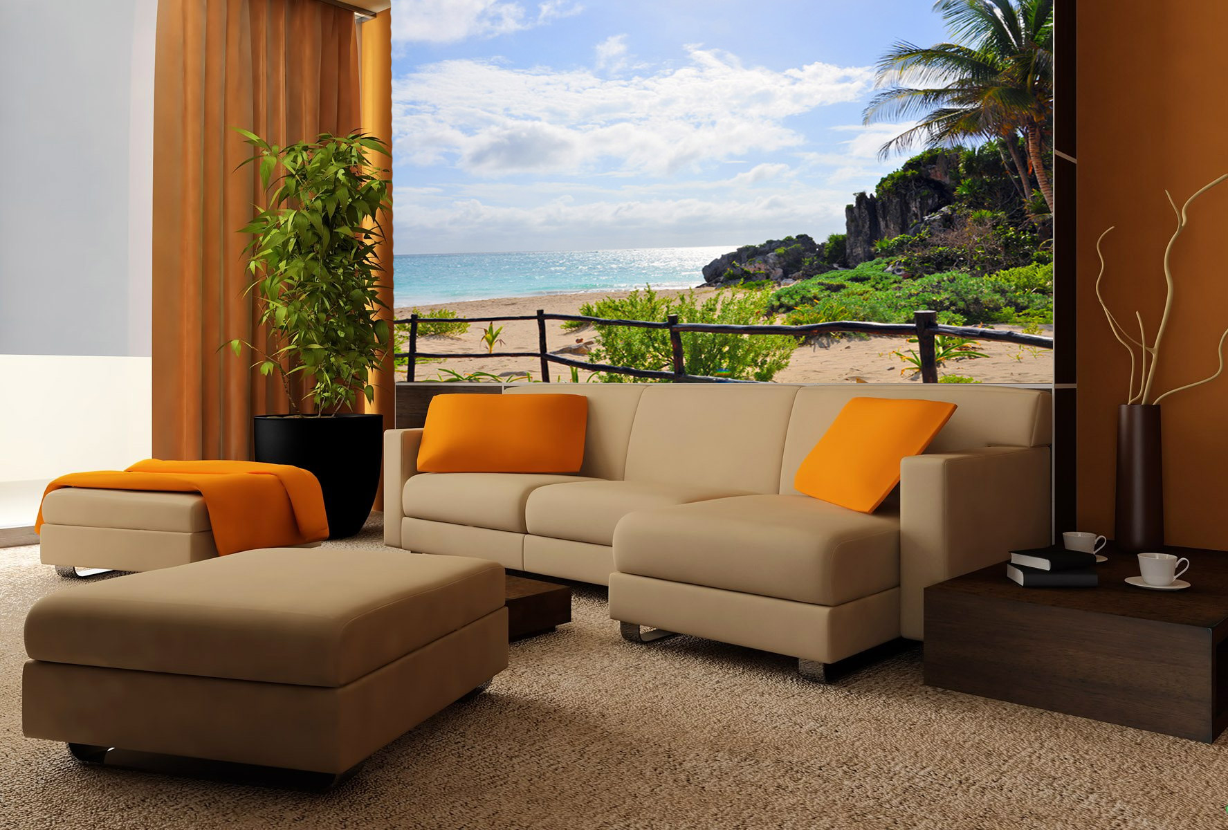 The color of the furniture is also important. With plots dominated by greenery, wooden tables and a white couch will look great. If the marine theme is depicted, then furniture in sandy shades will be appropriate. It is best to consult with the masters of design and discuss the future interior with them, a consultation will help to avoid mistakes and an overabundance of color spots.