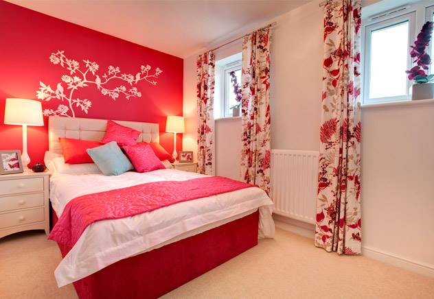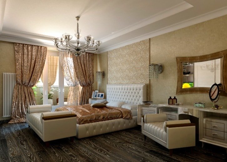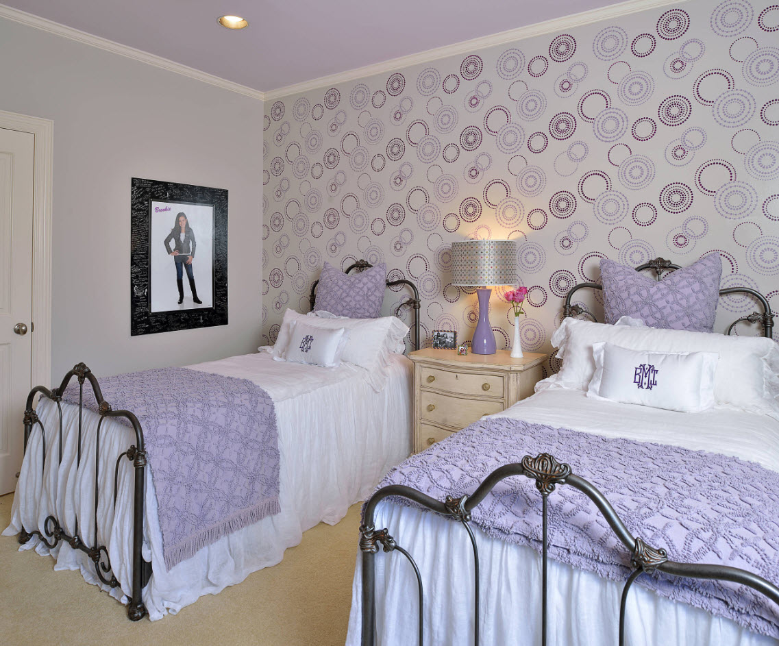 A vertical drawing will “raise” the ceiling a little, make the room more spacious. The floral ornament in the form of a diamond-shaped lattice also has the same property. However, the lower plane of the room will seem smaller than the actual size, so it is important to consider what the floors of the bedroom will be.
