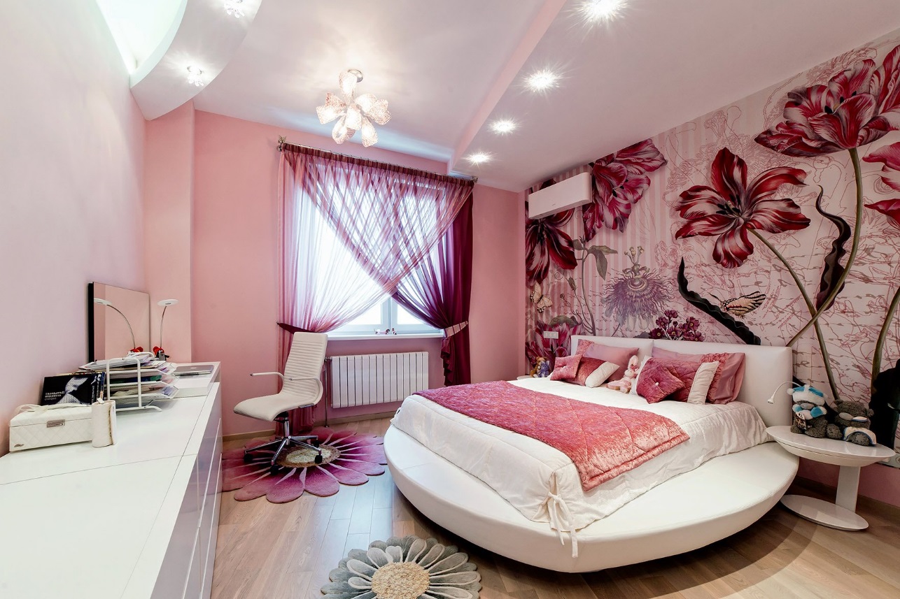 The use of photo wallpaper for the bedroom is the latest designer find, a large floral 3D print is especially relevant. It will divert attention from the many flaws of the room and make one wall accent. Large flowers visually “push” the walls of the bedroom.