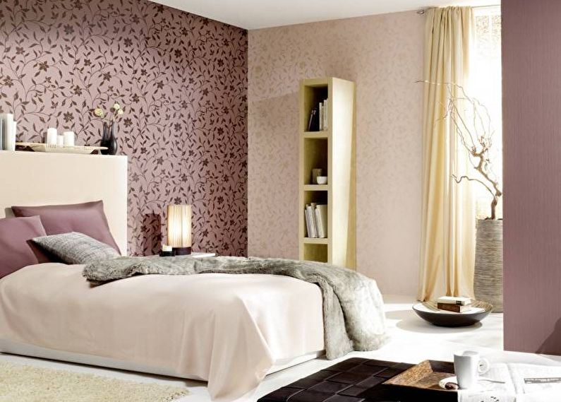 All these materials are suitable for the interior of a bedroom with two types of wallpaper, while expensive rolls can be taken for decorative decoration of one wall, paper - as the basis or background.