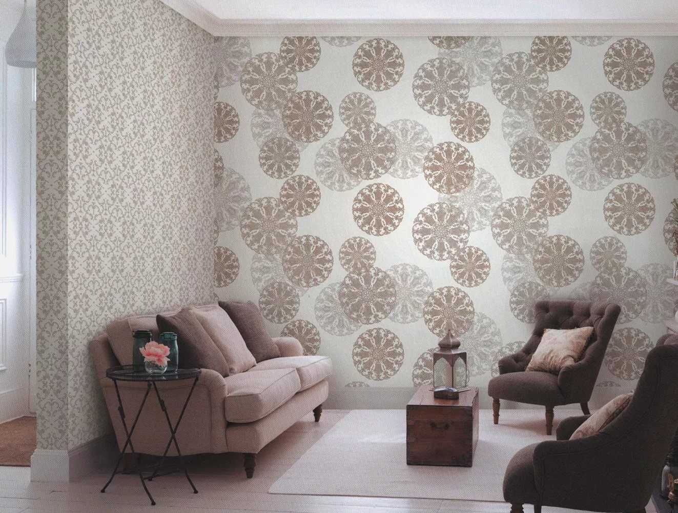 To create a delicate design in classic, country or provence styles, complement the beige wallpaper with light pastel colors. or patterned