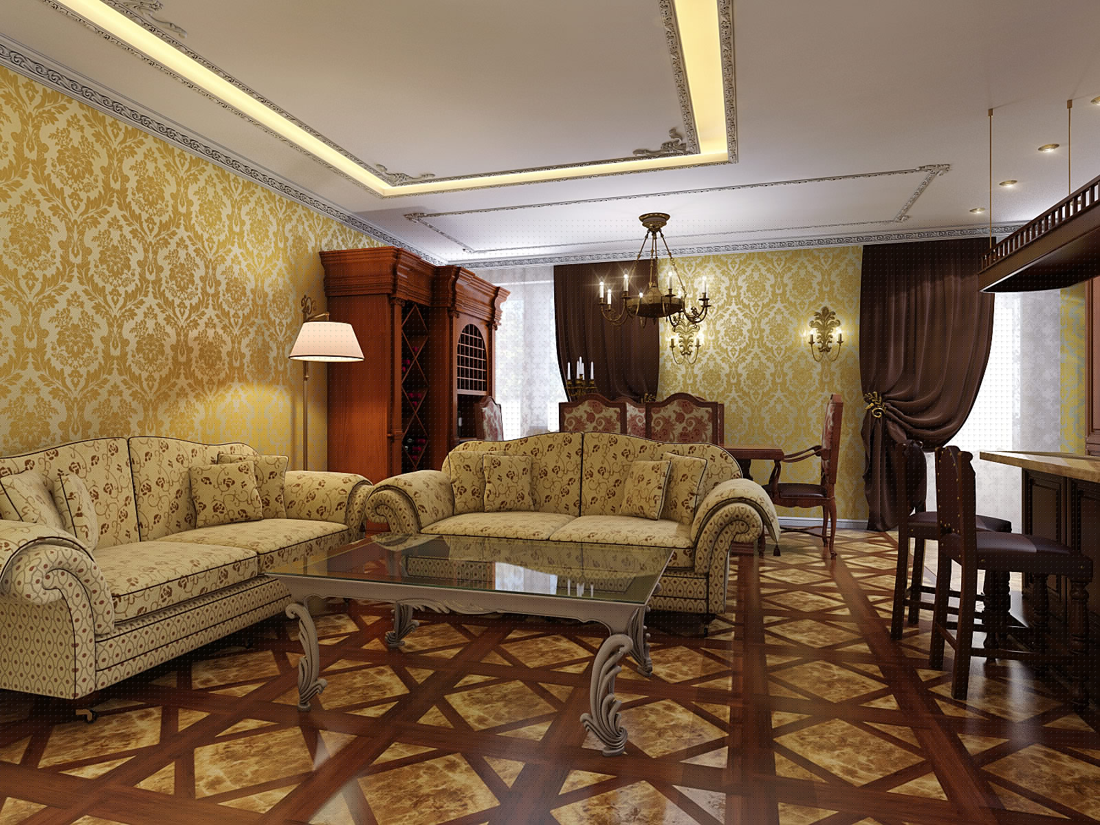 The luxury of the living room, the walls of which are decorated with chic wallpaper with gilding and decorating details in the same style