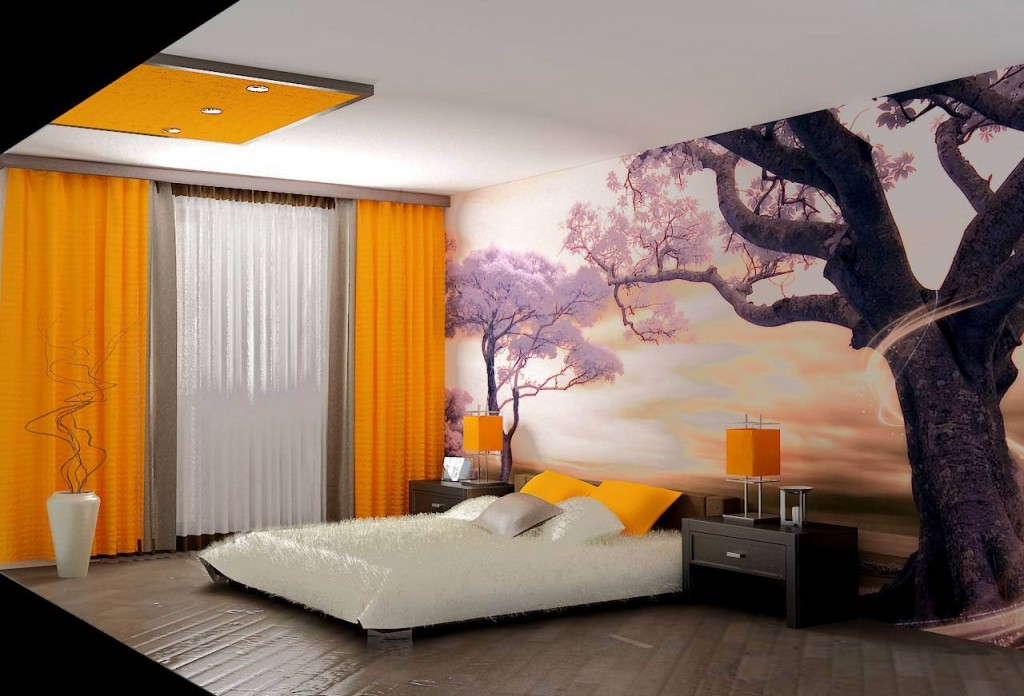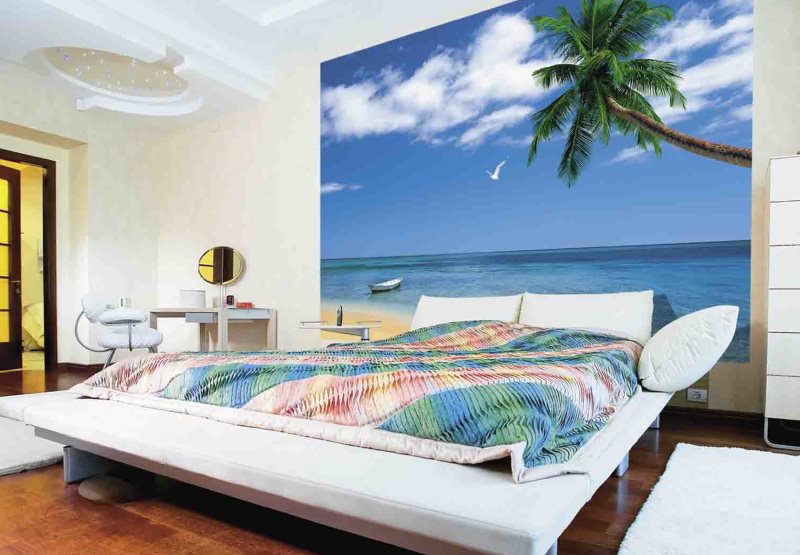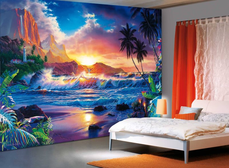 In any bedroom, wallpapers with photographs of natural landscapes, forests, marine themes look great. Walls with such photos not only calm the nervous system, but also visually expand the space of the room, especially pictures with a 3D effect. Natural colors enable the body to fully relax.