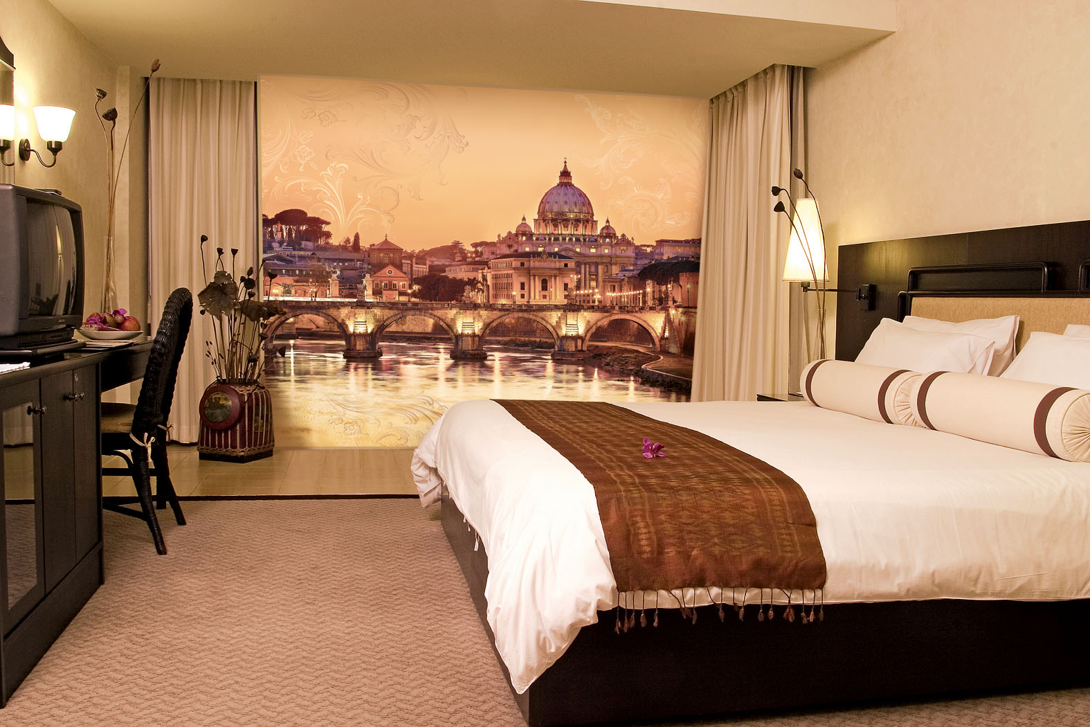 In order for the photo wallpaper to fit into the bedroom interior most successfully and become its central component, it is desirable to free up space in front of the wall. So, if your choice of image for wallpaper is focused on a realistic photo of the city, natural landscape, interior, the wall should remain as free from furniture as possible. This is necessary in cases where only one wall is used under the mural.
