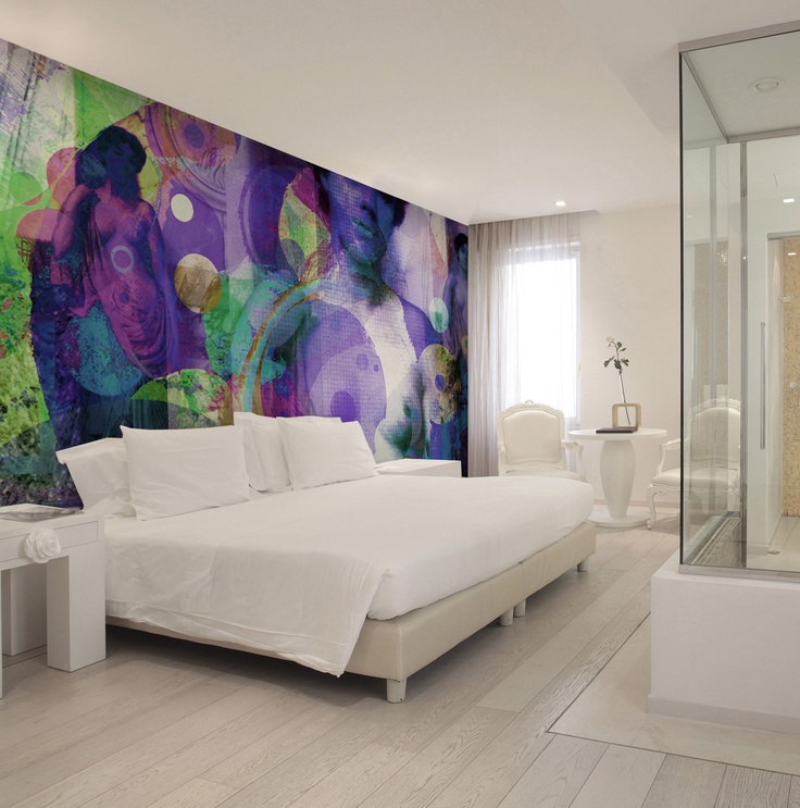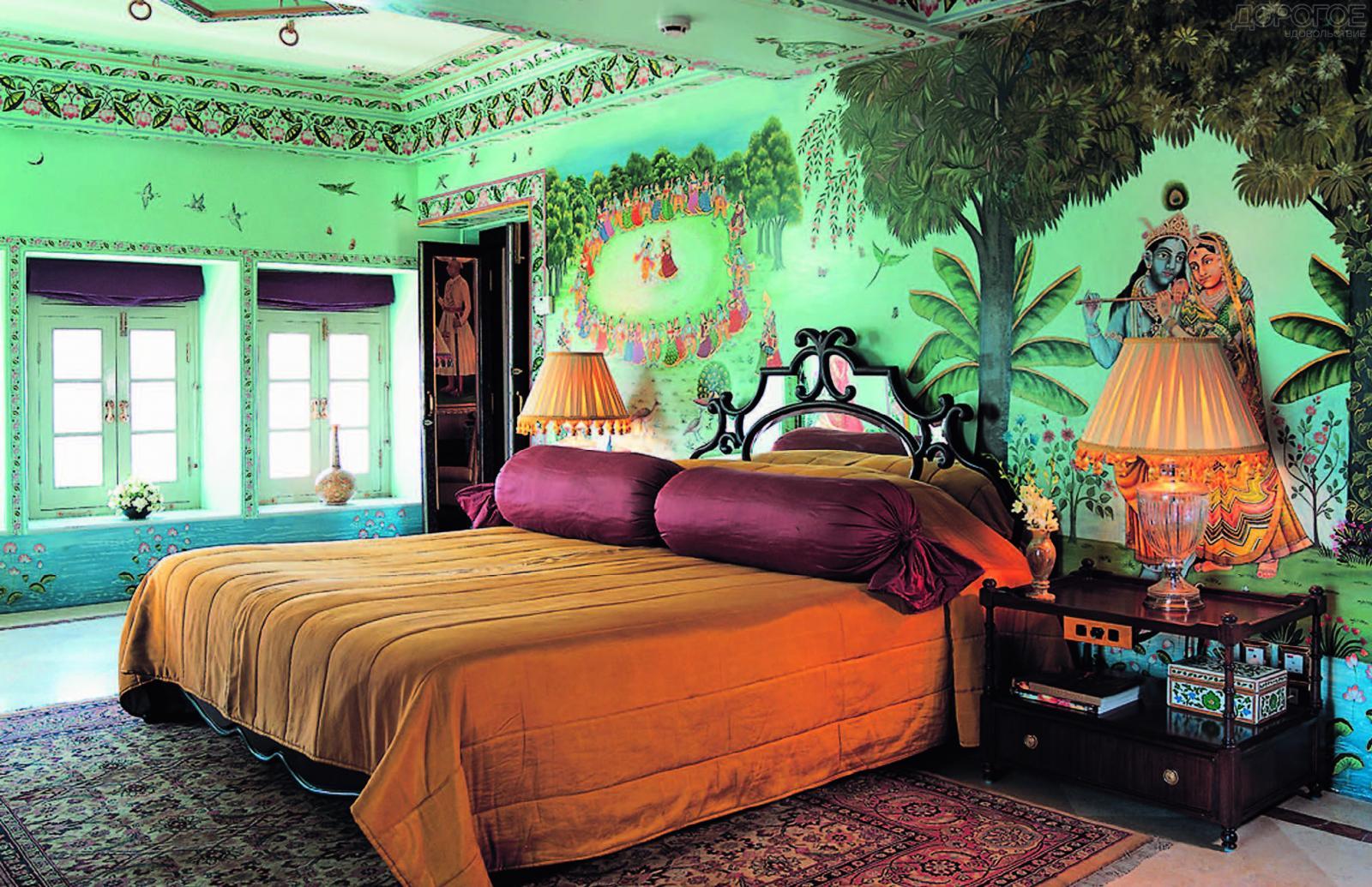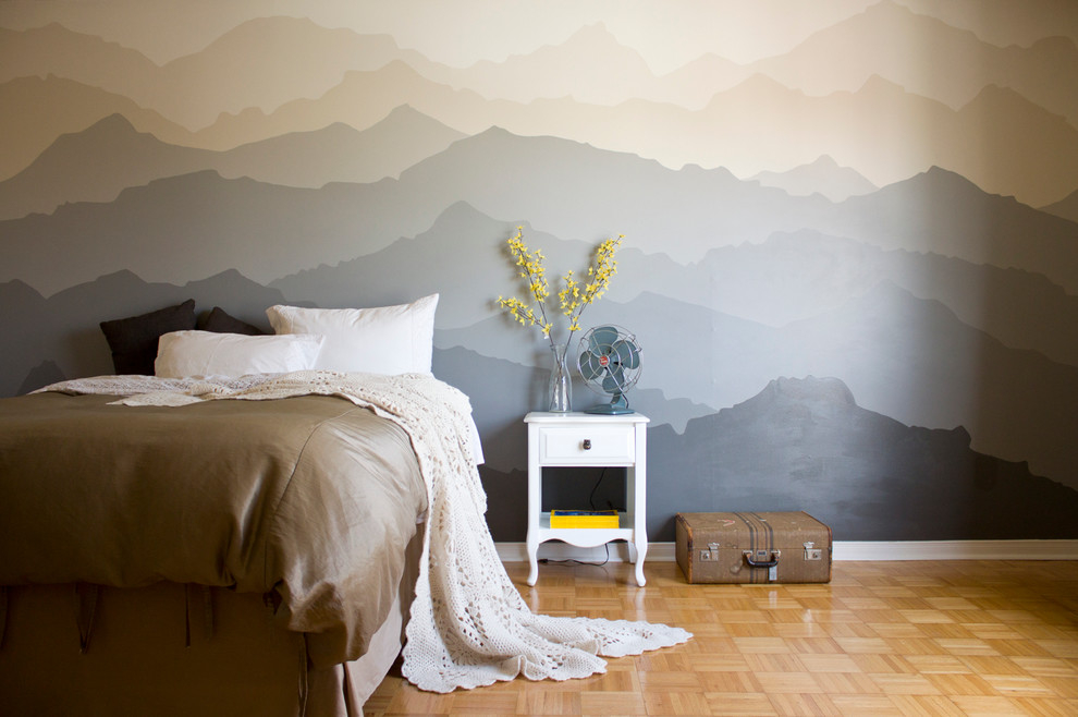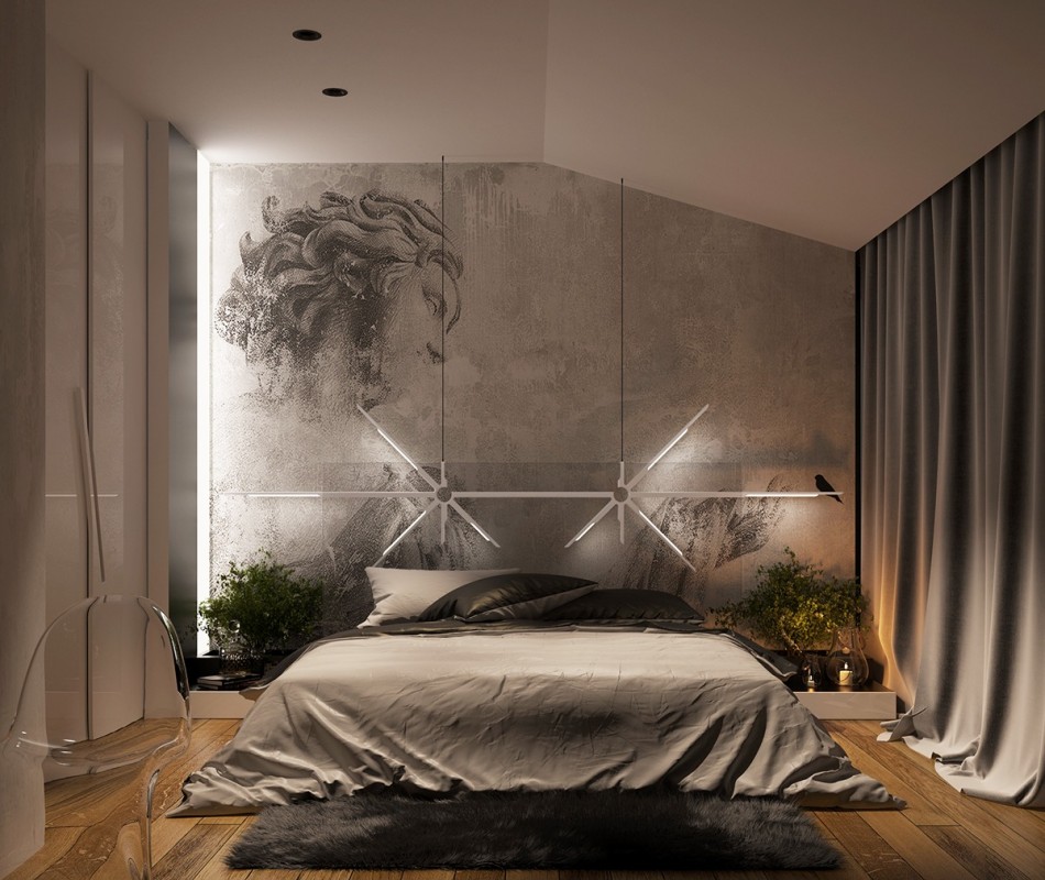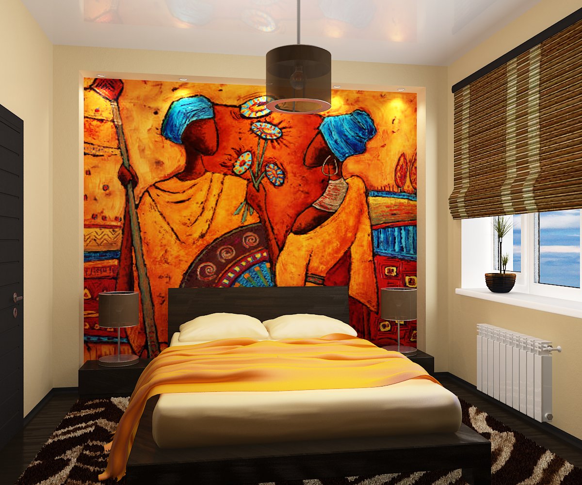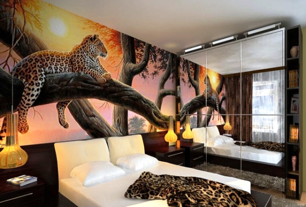 In the bedroom, wall murals look excellent, differing by several tones from the dominant color of the interior