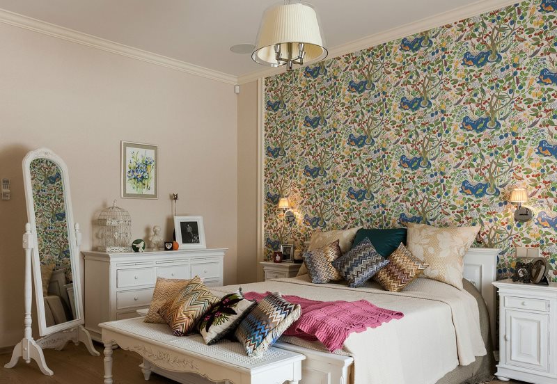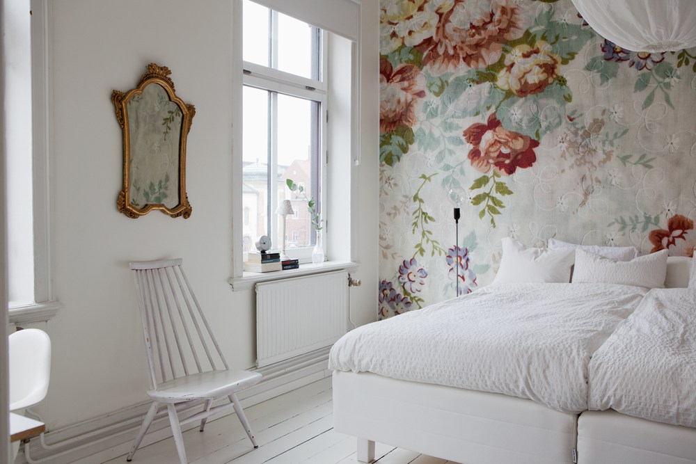 Traditionally, the interior of a bedroom with a photo wallpaper is associated with a picture or photo above the head of the bed. But the choice of place for wallpaper stickers is not limited. Well-chosen ornaments or photos can replace many elements of decor and decor.