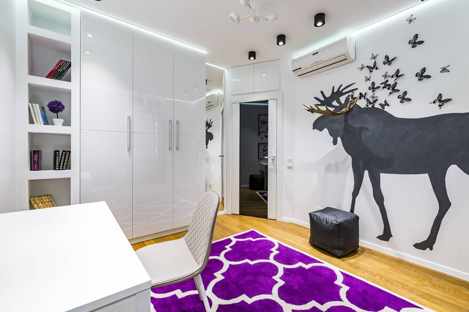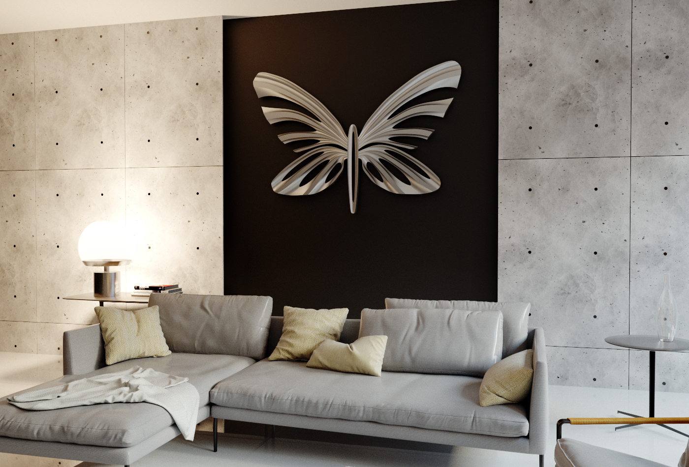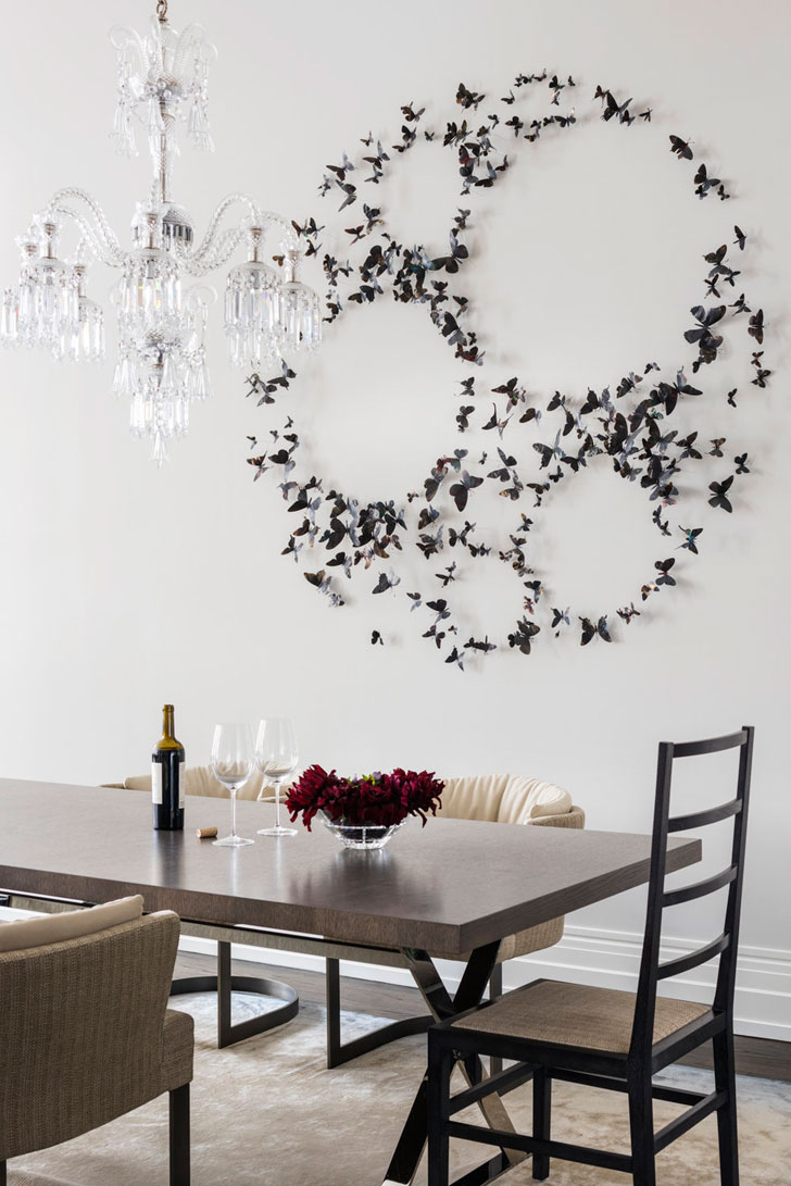 Butterflies will become a bright accent for a monochrome interior. Their color can be absolutely any: from strict white or black tones to the brightest neon shade. The main thing is that they organically fit into the interior, and their color echoes the color of the walls and other elements.