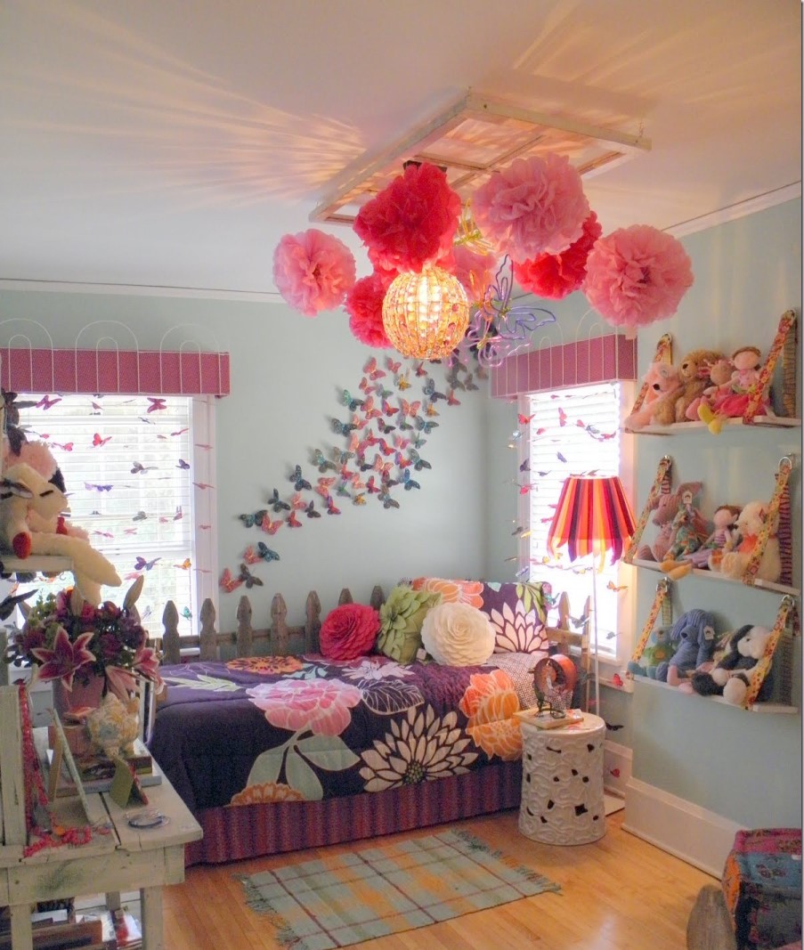 To implement this idea, we need a hoop, fishing line, ribbon, and the butterflies themselves, the numerous manufacturing options of which we have already considered. We fix the hoop under the ceiling with satin or chiffon ribbons, evenly attach the fishing line to the hoop over the entire area. Place butterflies made of paper or cardboard on a fishing line. You can make them both monophonic and color. This voluminous decorative composition looks very impressive in the women's bedroom and emphasizes the romance and femininity of the hostess.