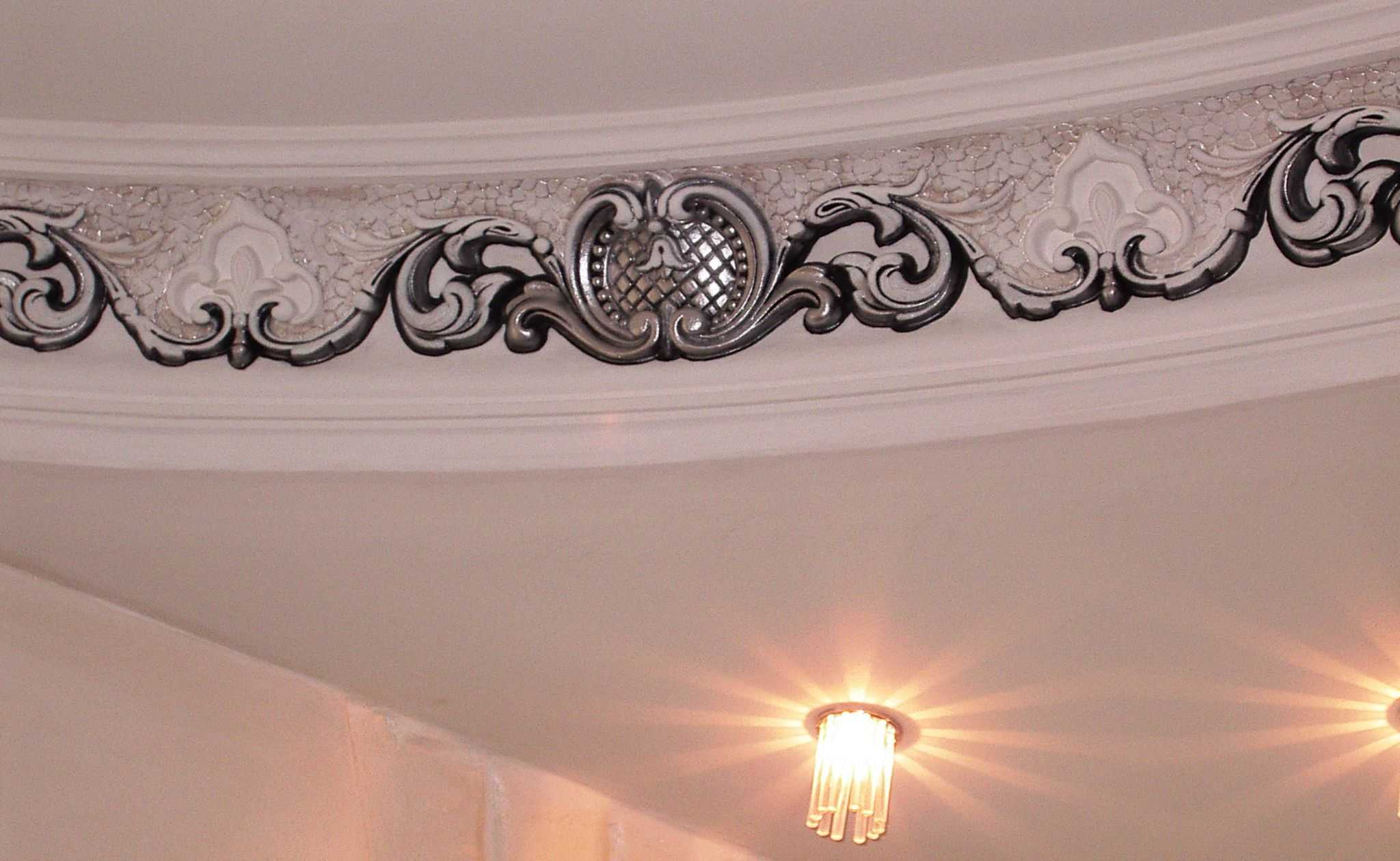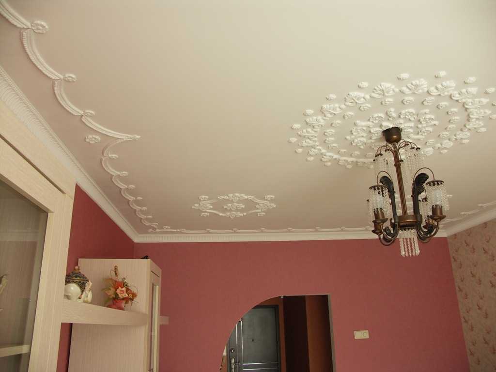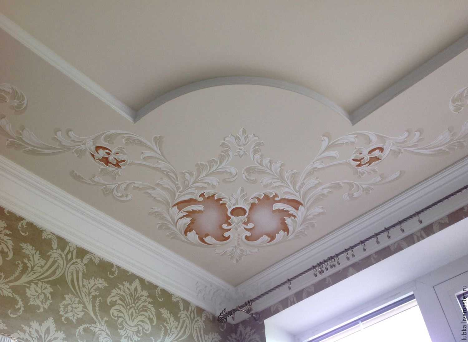 The stucco ceiling decor will bring aristocratic notes of the 18-19th century to the room and make it more official. Suitable for a spacious living room with high arches, as it visually makes it heavier and makes the room smaller.
