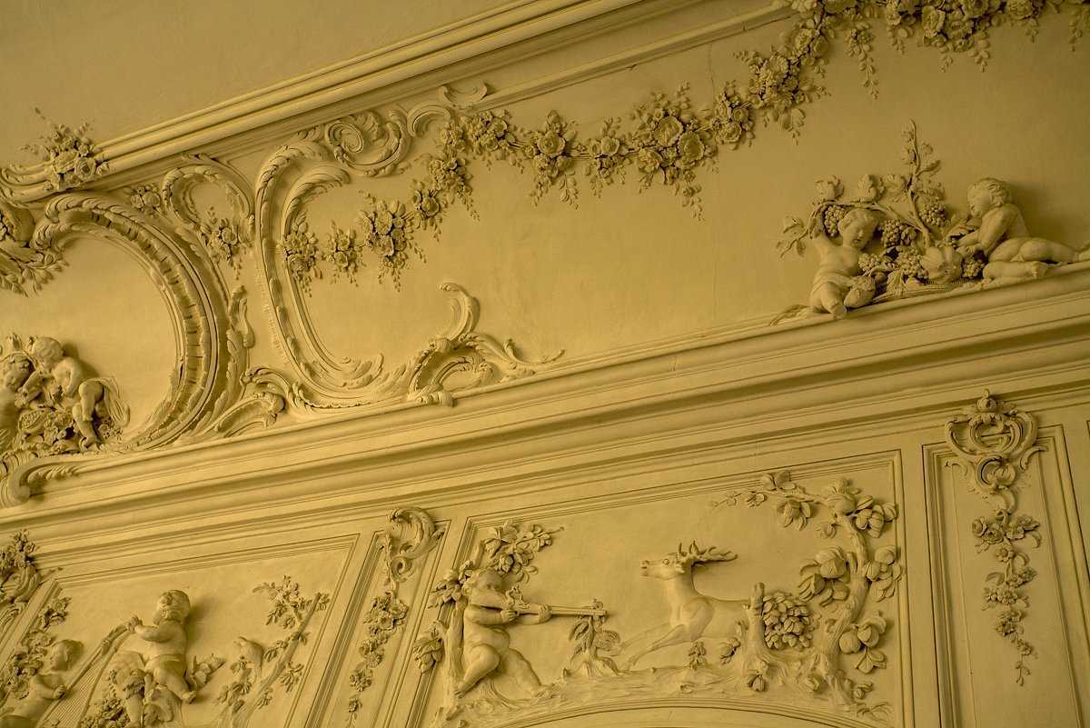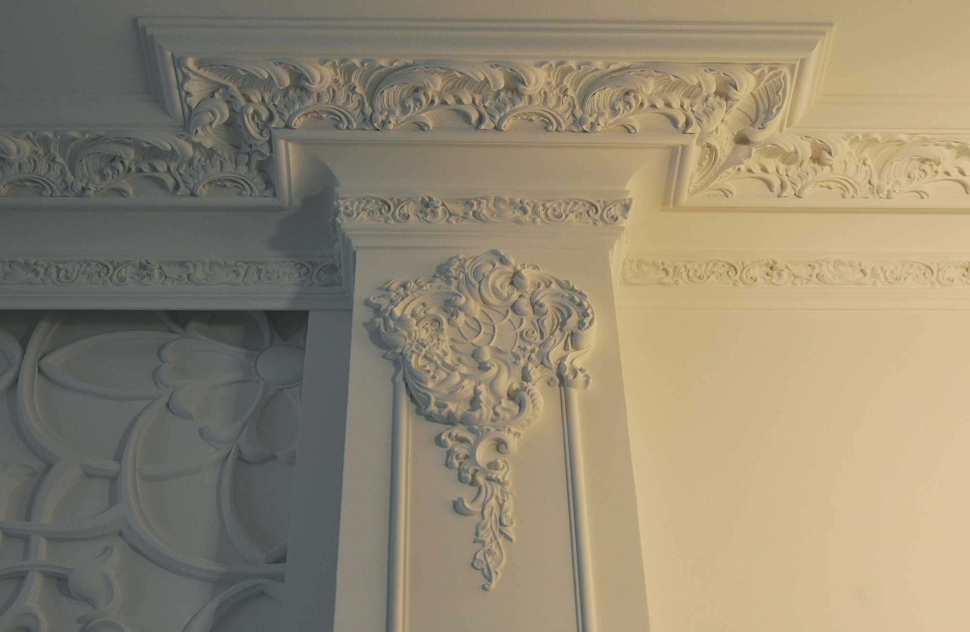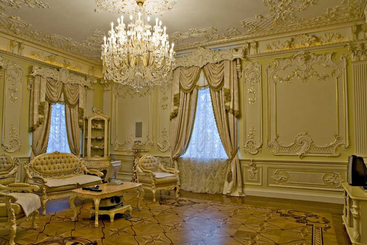 The stucco ceiling decor will bring aristocratic notes of the 18-19th century to the room and make it more official. Suitable for a spacious living room with high arches, as it visually makes it heavier and makes the room smaller.