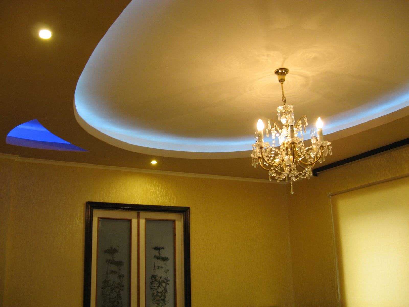With it, you can adjust the lighting. Turning on the spotlights in the ceiling and creating protrusions in the right places, you get the desired result in the separation of the light zones of the room.