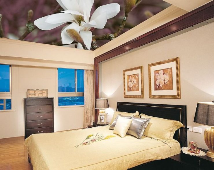 Stretch vinyl ceilings in the bedroom made of heavy-duty polymers are now the most popular because of their perfectly flat surface.