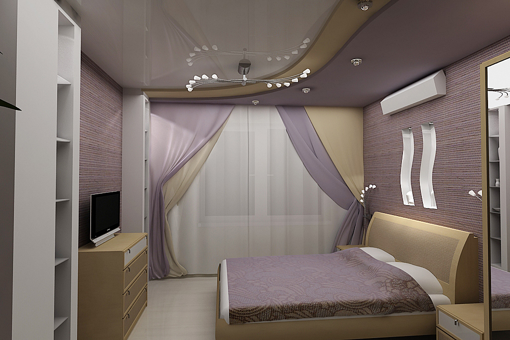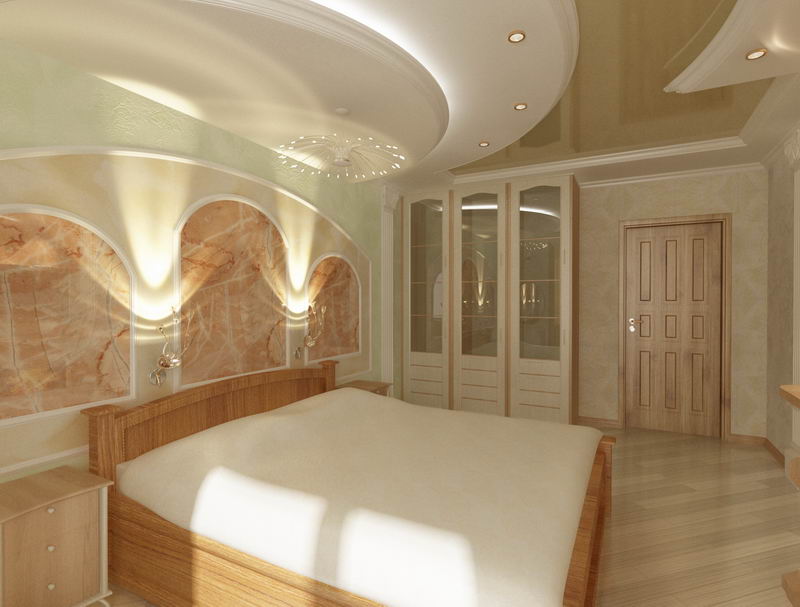 Proper design of the ceiling in the bedroom with low light by natural light should not be too complicated.