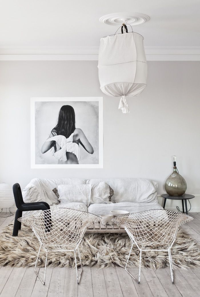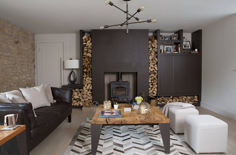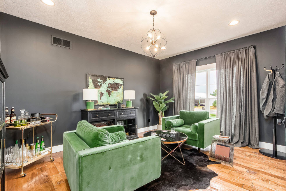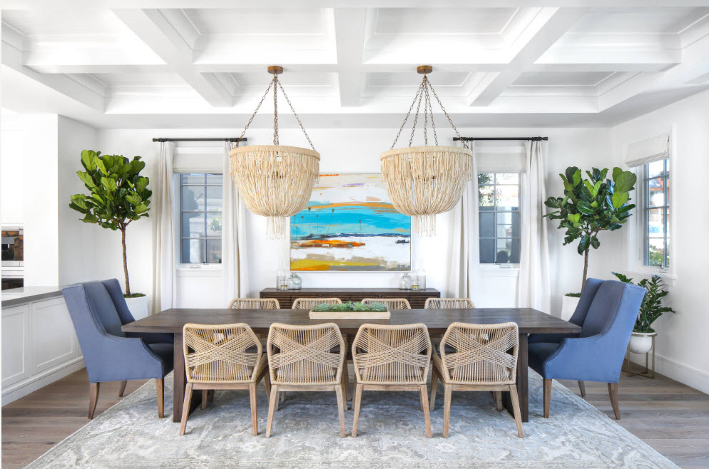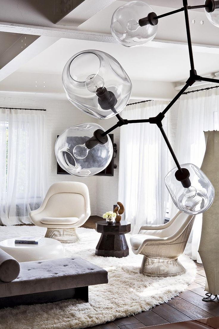 For a spacious living room, a pair of identical pendant lights is a rather often used technique that allows you to illuminate a large area and create an original interior