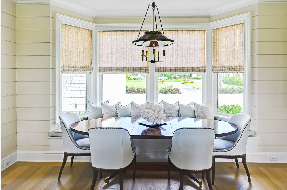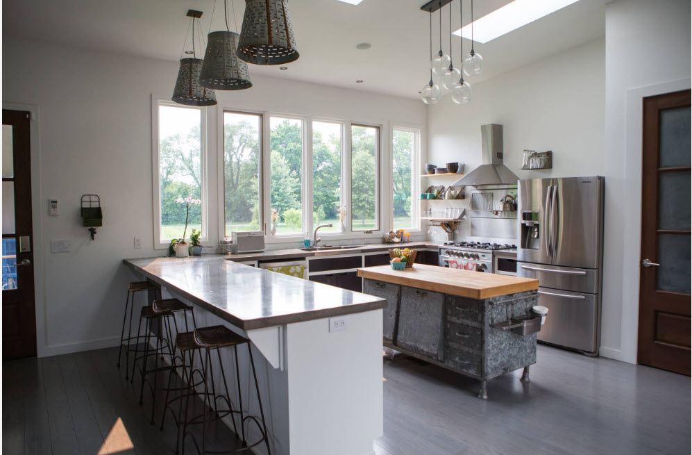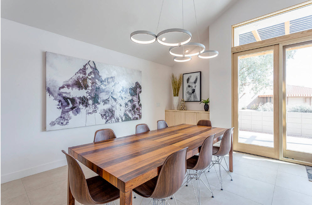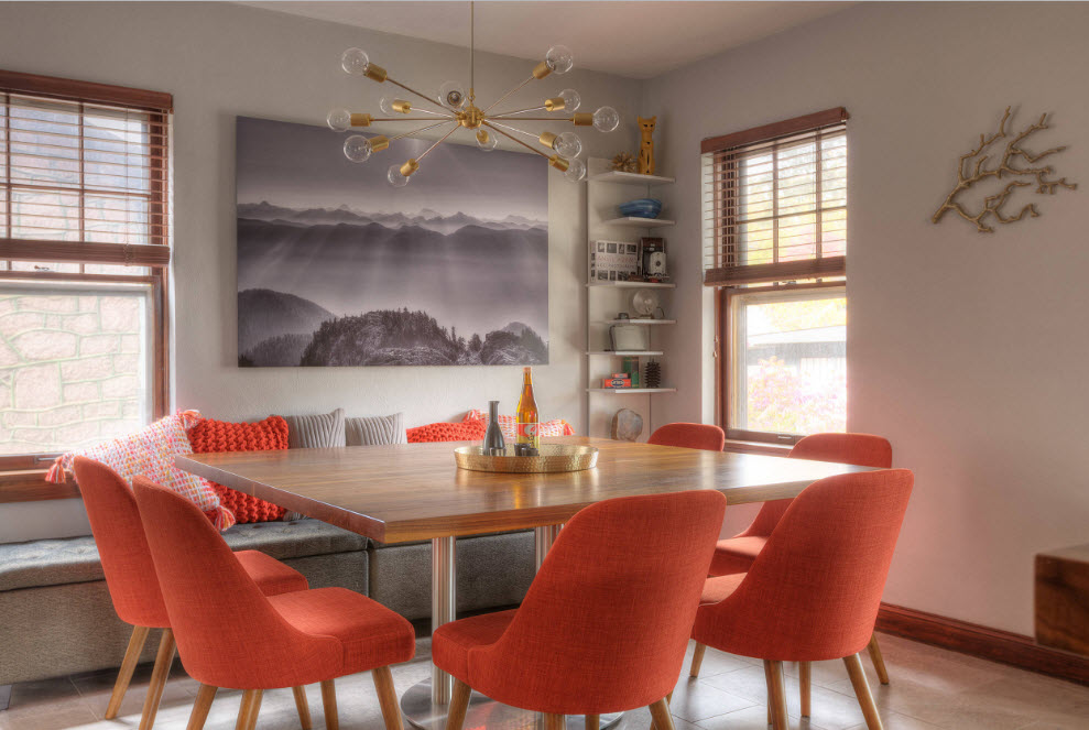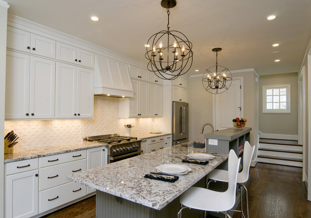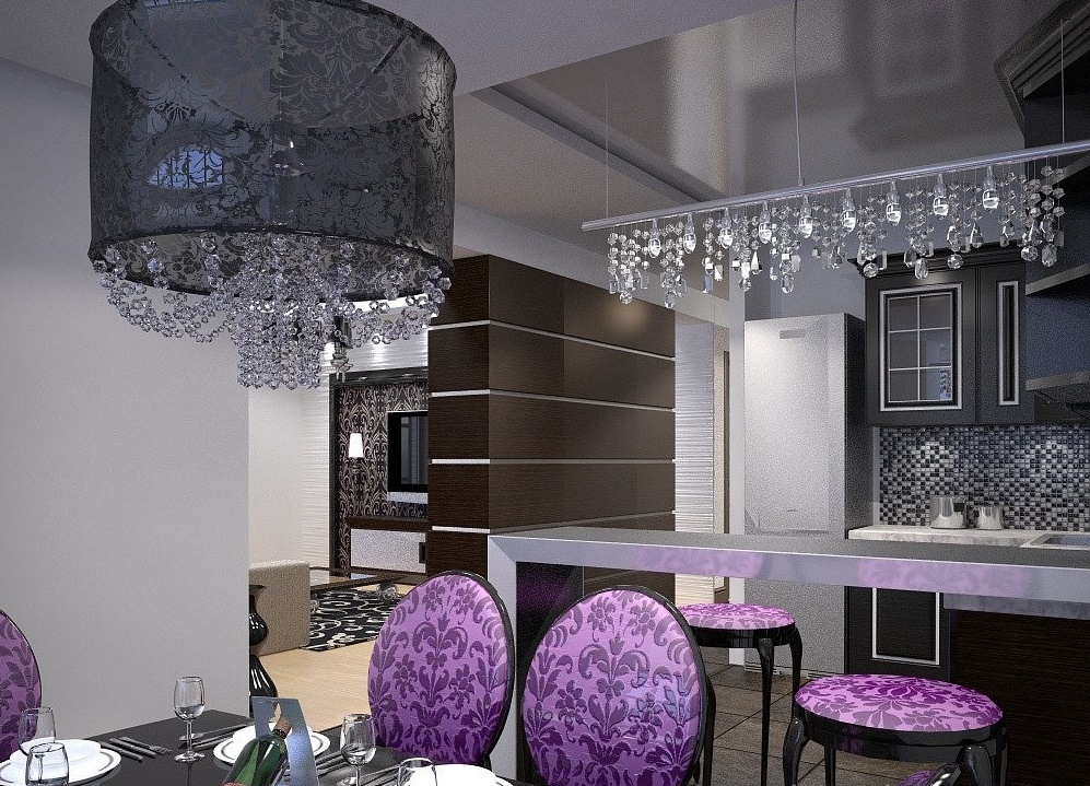 A well-chosen diameter of the chandelier that acts as a zoning of the dining part of the kitchen