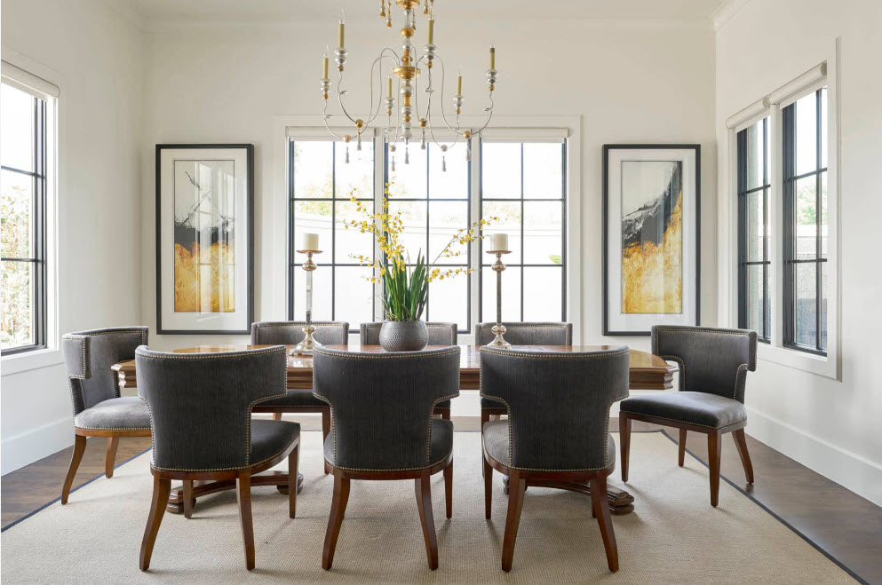 The black chandelier looks extravagant and goes well with the bright interior and high white ceiling.