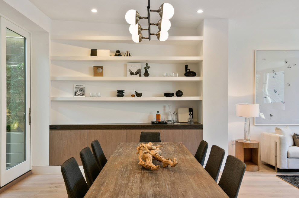 The lamp on a wide ceiling mount has the specifics of “raising” the ceiling and making the room visually taller. This form will transform the room into a modern style.