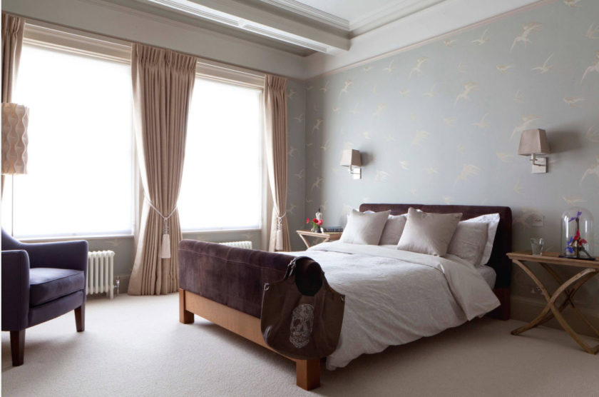 Thick black curtains on the floor complete the stylish discreet bedroom interior