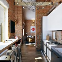 The main difference between the industrial loft is the presence of a large number of wiring, which is not masked, but is located around the perimeter of the entire room.