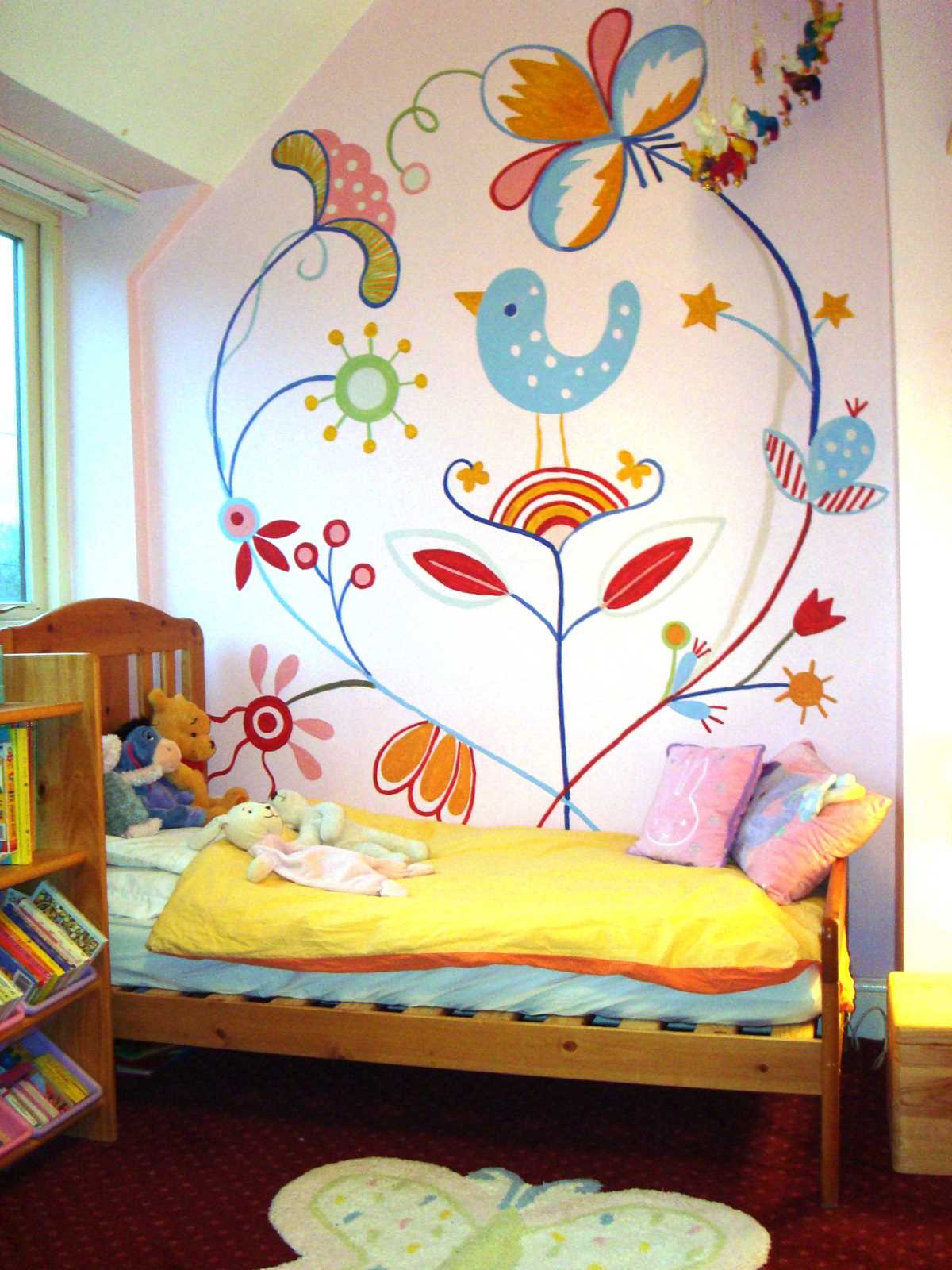 From a psychological point of view, aggressive images and flashy colors should not be used for wall painting in a children's room. Here you can use: