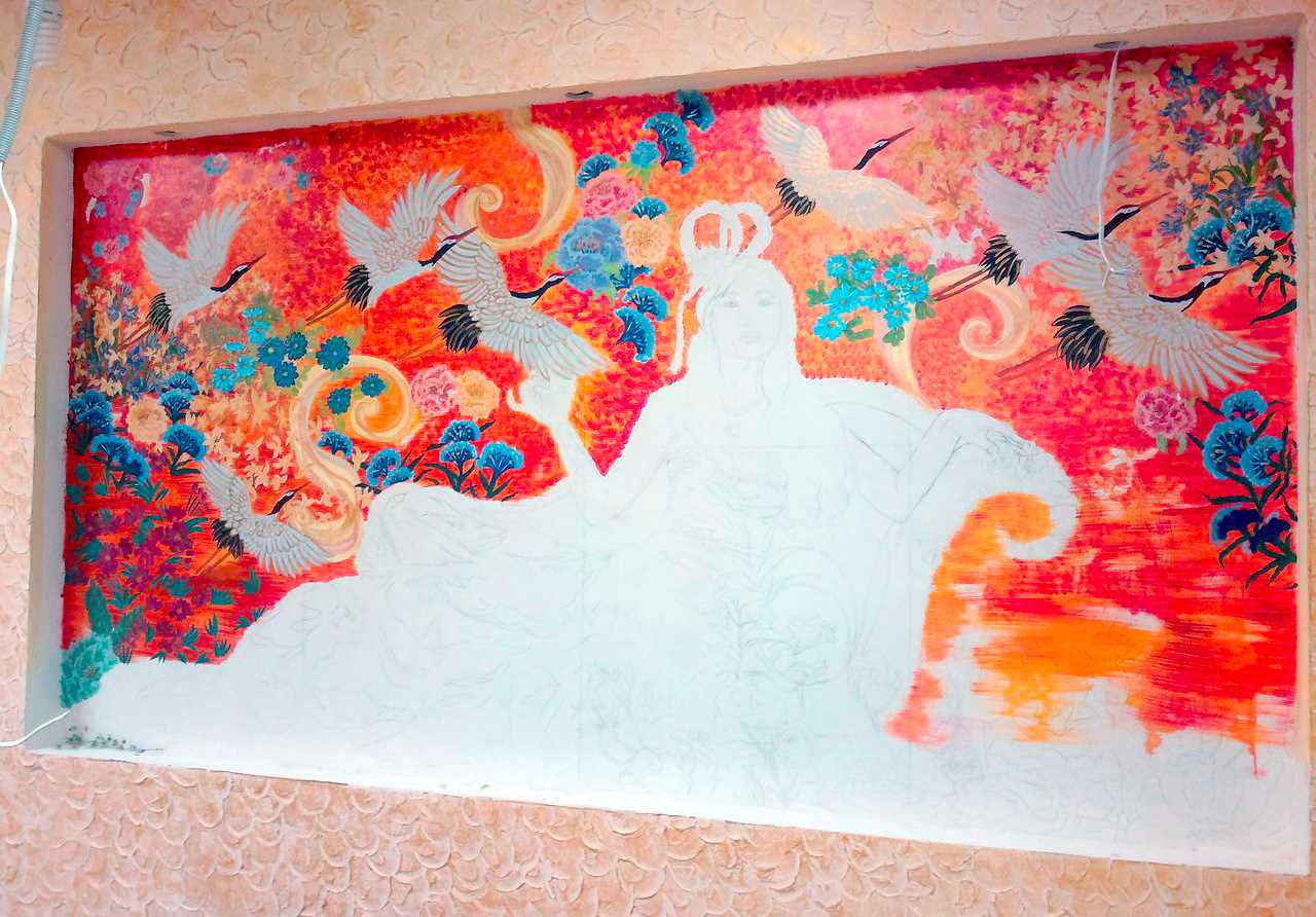 The work is carried out with special paints on dry plaster with lime in its composition. After the drawing has dried, it is coated with a special calcium film. |
