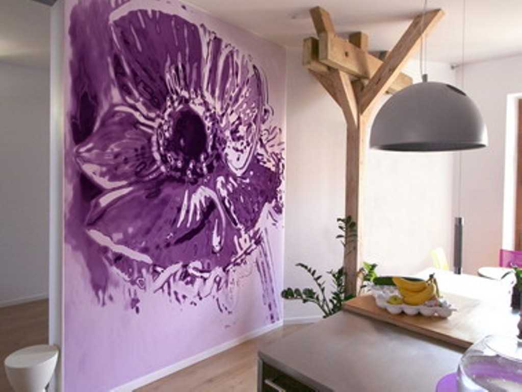 The nuance of painting walls in the kitchen interior is the choice of its location. Do not paint the wall near the sink or stove. Constant contact with water and temperature changes can adversely affect wall painting. If this arrangement is important for the owner of the kitchen, you should choose moisture-resistant paints for work, as well as varnish the creation in several layers.