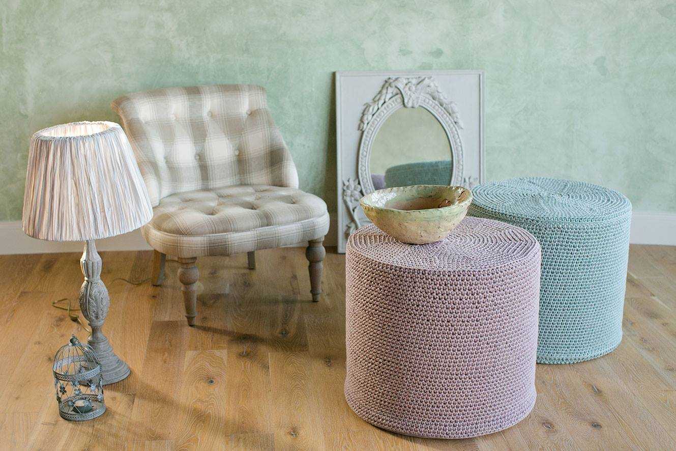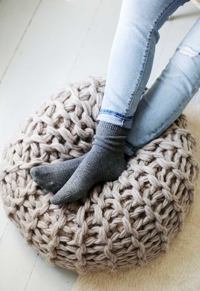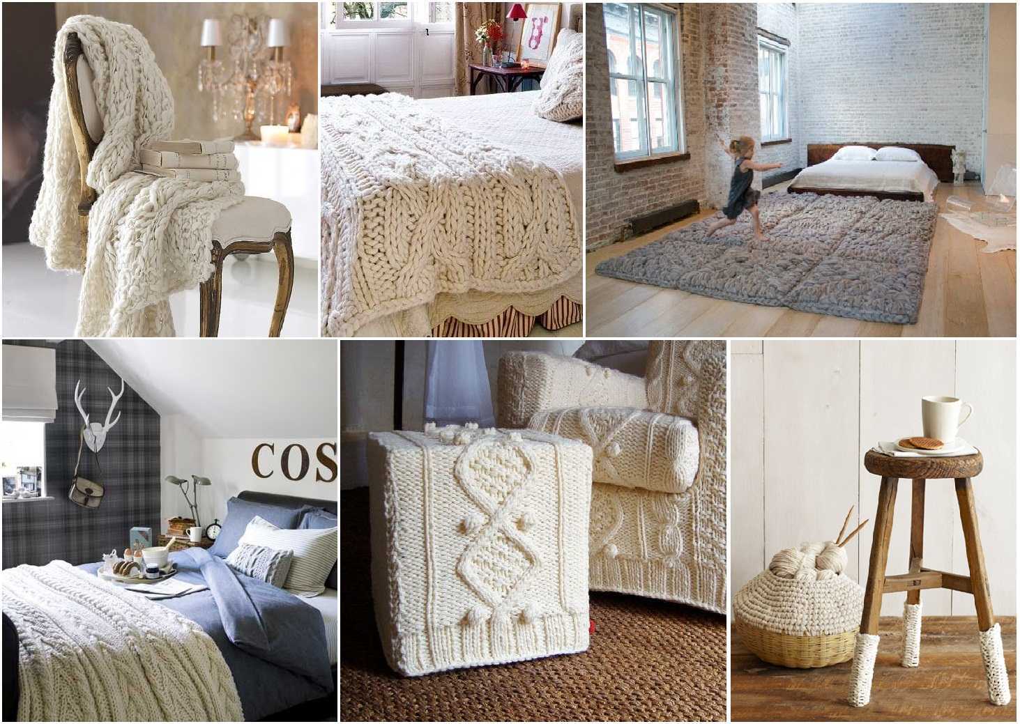 Hook and thick yarn, ideas from designers allow you to create unusual furniture, pillows, carpets. Modern knitting techniques have come up with the use of hands instead of a hook - using the yubiami technique, you can do things of especially large knitting - plaids and bedspreads.