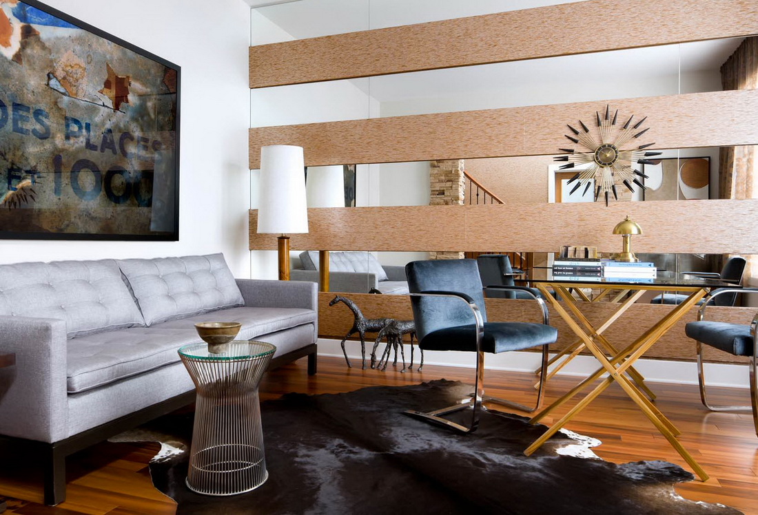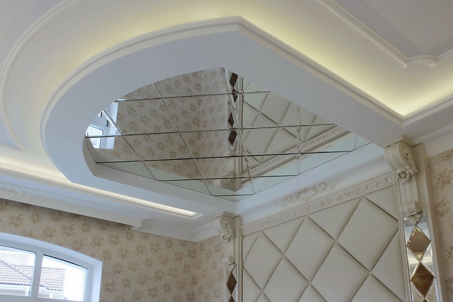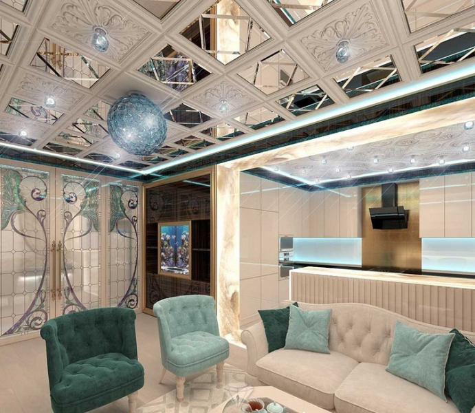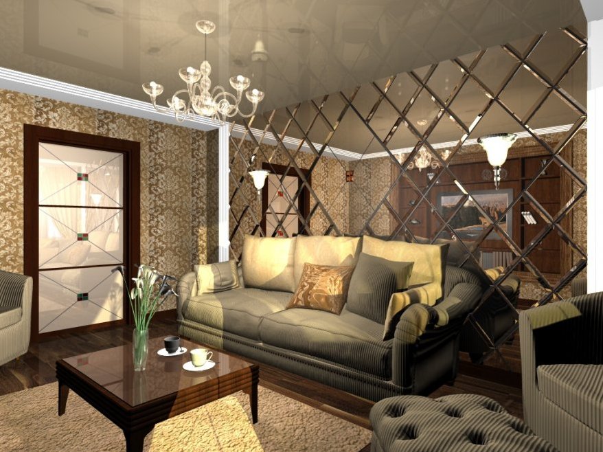 | Living room | When zoning the ceiling at different levels, you can add to the design of such details. Mirror tiles in the living room interior can be used to design one wall. If placed next to the elements, the surface will double their effect. When the plants are arranged, there will be a feeling that there are more of them. |