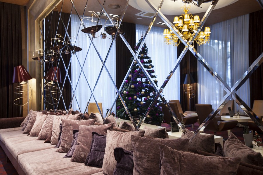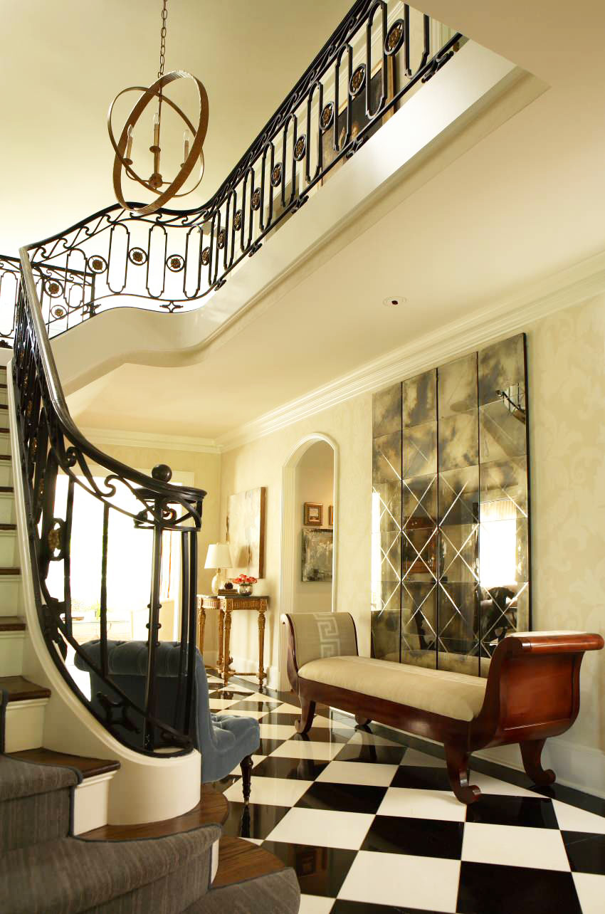Mirror tiles in the interior are rarely used for floors. Using a similar technique, other reflective details in the design should be excluded.