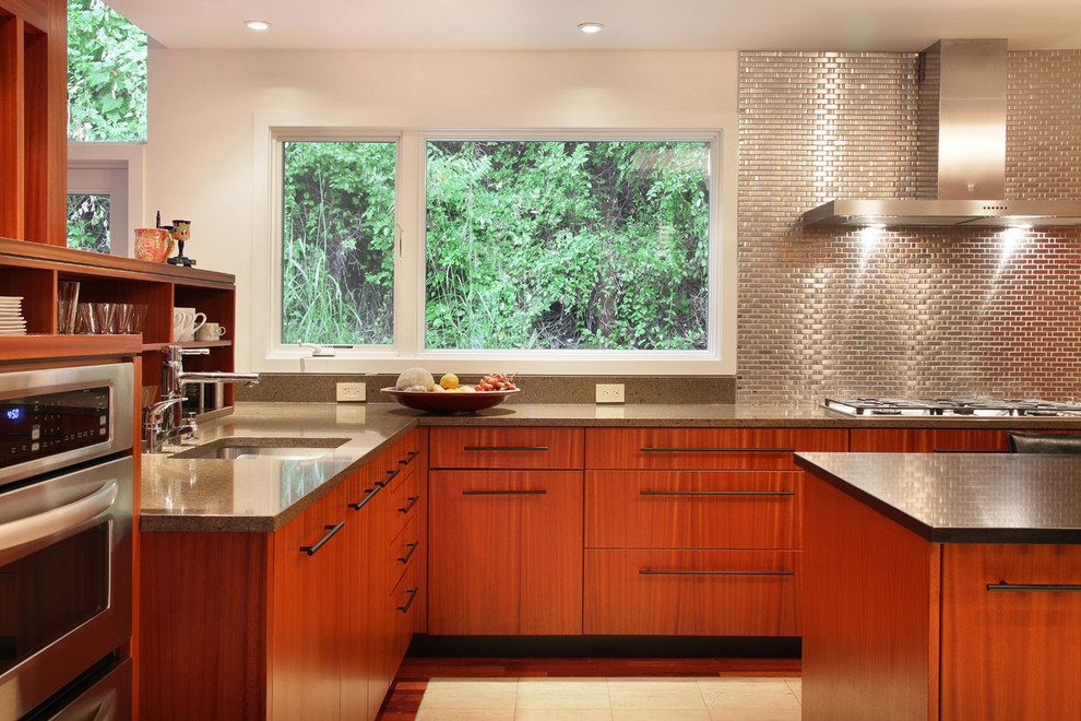 You can use the cladding for the entire wall or place a panel. In addition, it is recommended to install furniture with a glossy surface. You should be careful about the idea of decorating the kitchen in this way because of the high level of pollution. It is better to choose areas located further from the work area.