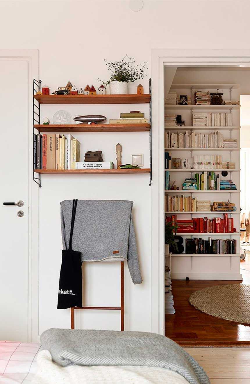 The first sign of a good Swedish-style interior is shelving and shelving. It is the open cabinets that give the appearance of the apartment lightness and ease.