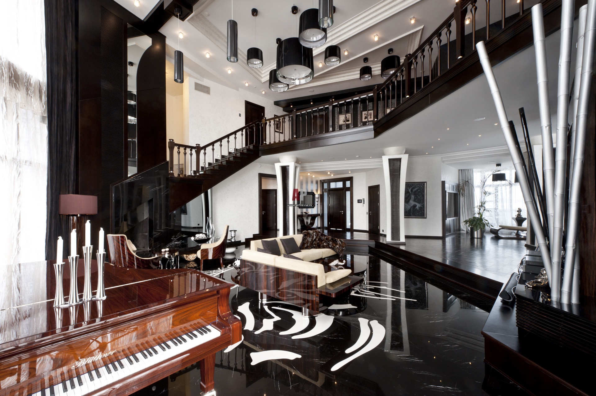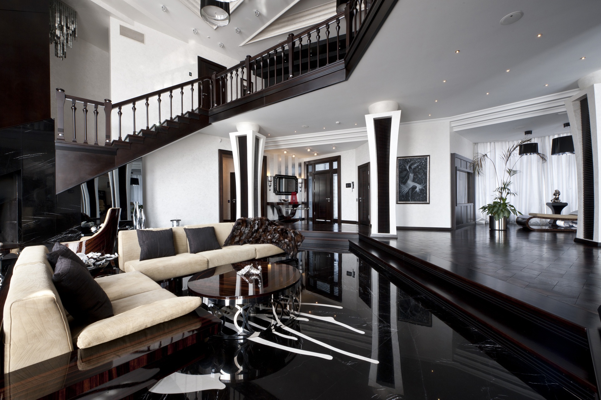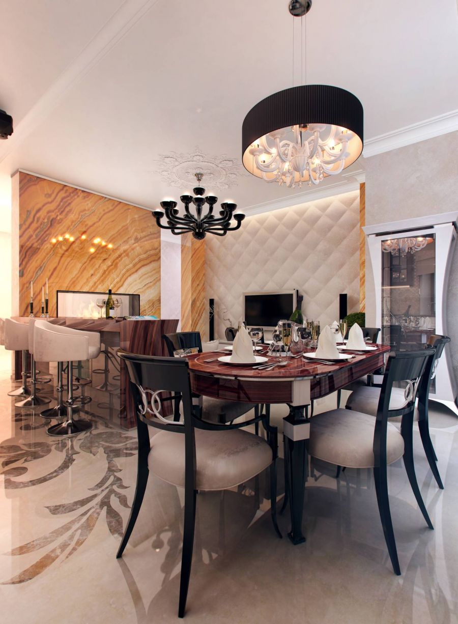 Art Deco in the interior can easily be described in two words - expensive and rich. Furniture for rest - only from genuine expensive leather, an abundance of mirrors. Stucco molding, sculptures - all this is surprisingly harmoniously selected so that there is no kitsch, sloppiness - this is an exquisite luxury, created sometimes in two colors - black and white.