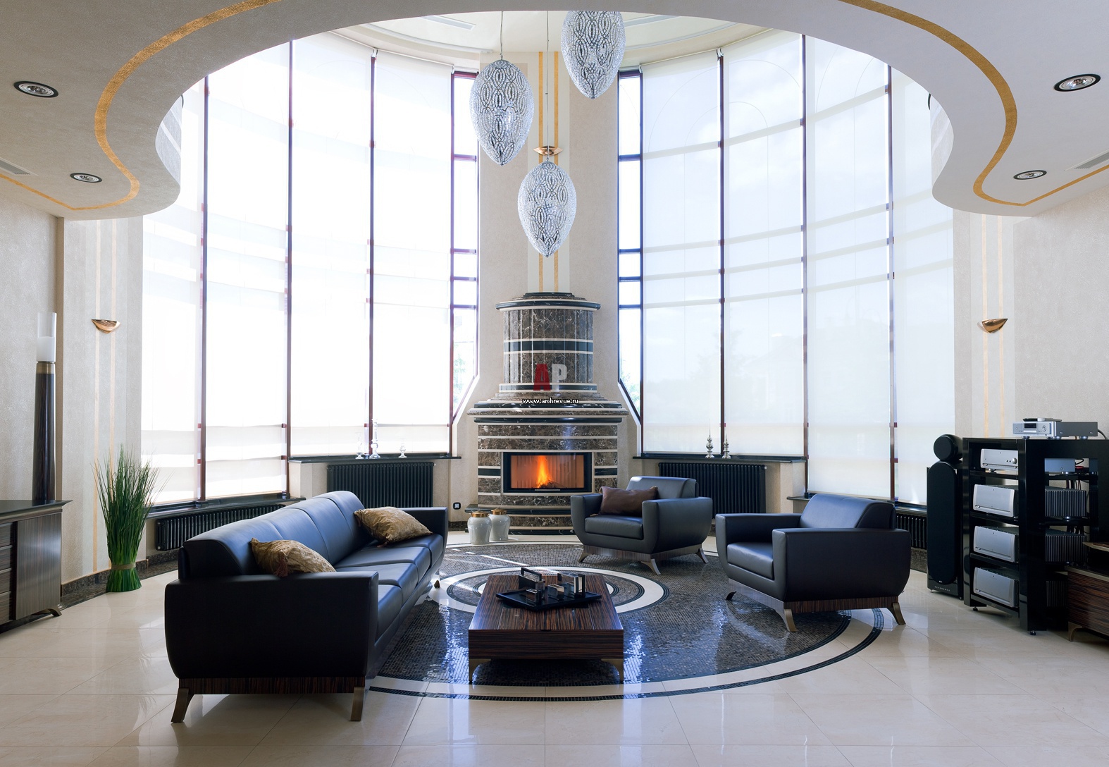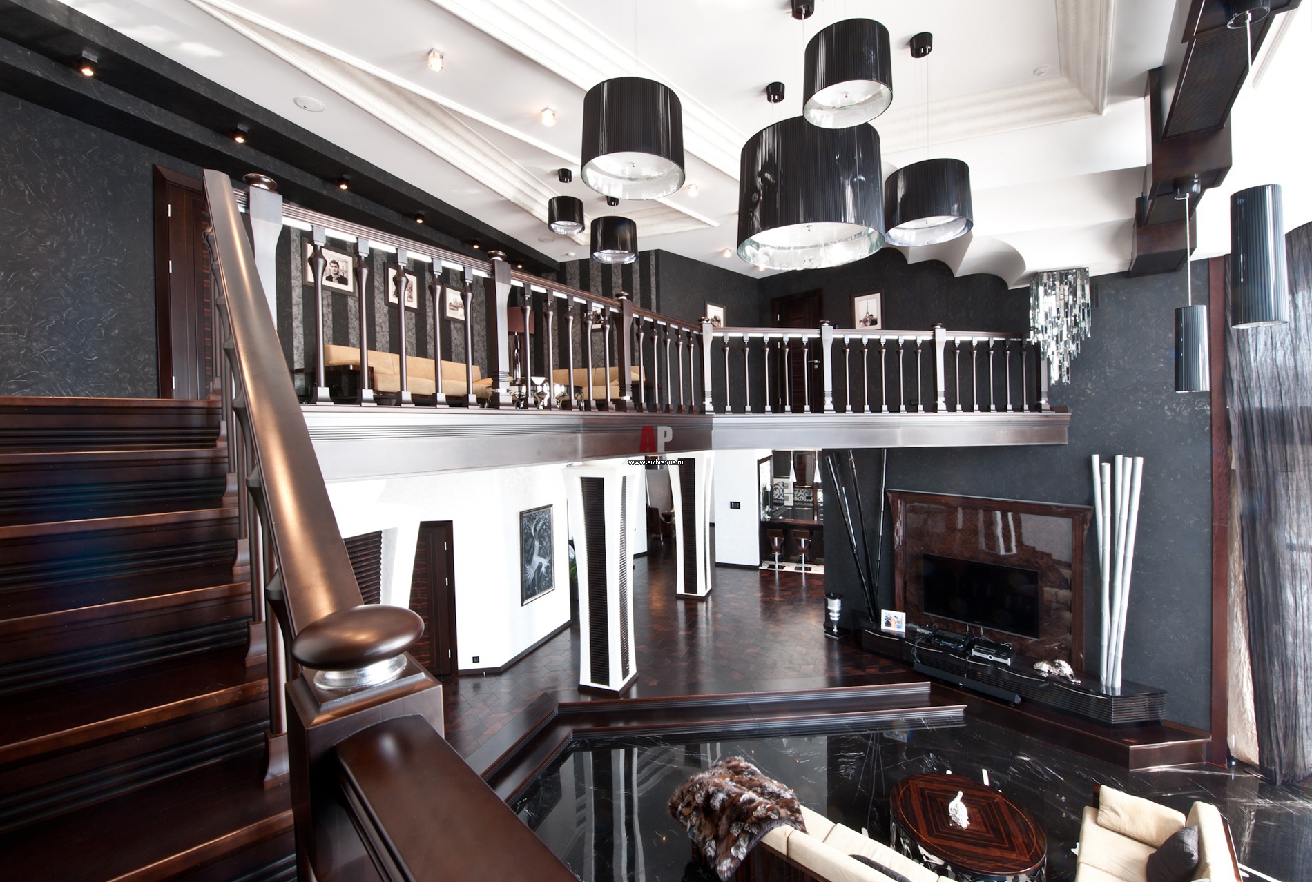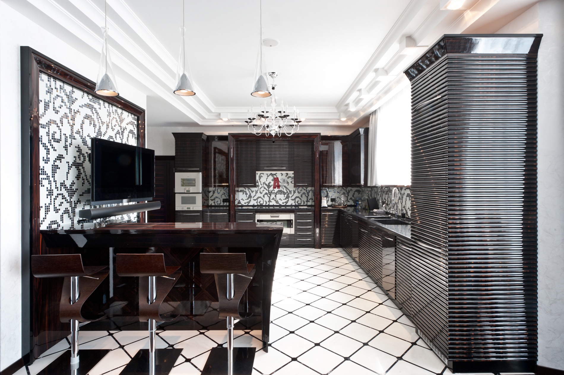 Art Deco in the interior can easily be described in two words - expensive and rich. Furniture for rest - only from genuine expensive leather, an abundance of mirrors. Stucco molding, sculptures - all this is surprisingly harmoniously selected so that there is no kitsch, sloppiness - this is an exquisite luxury, created sometimes in two colors - black and white.